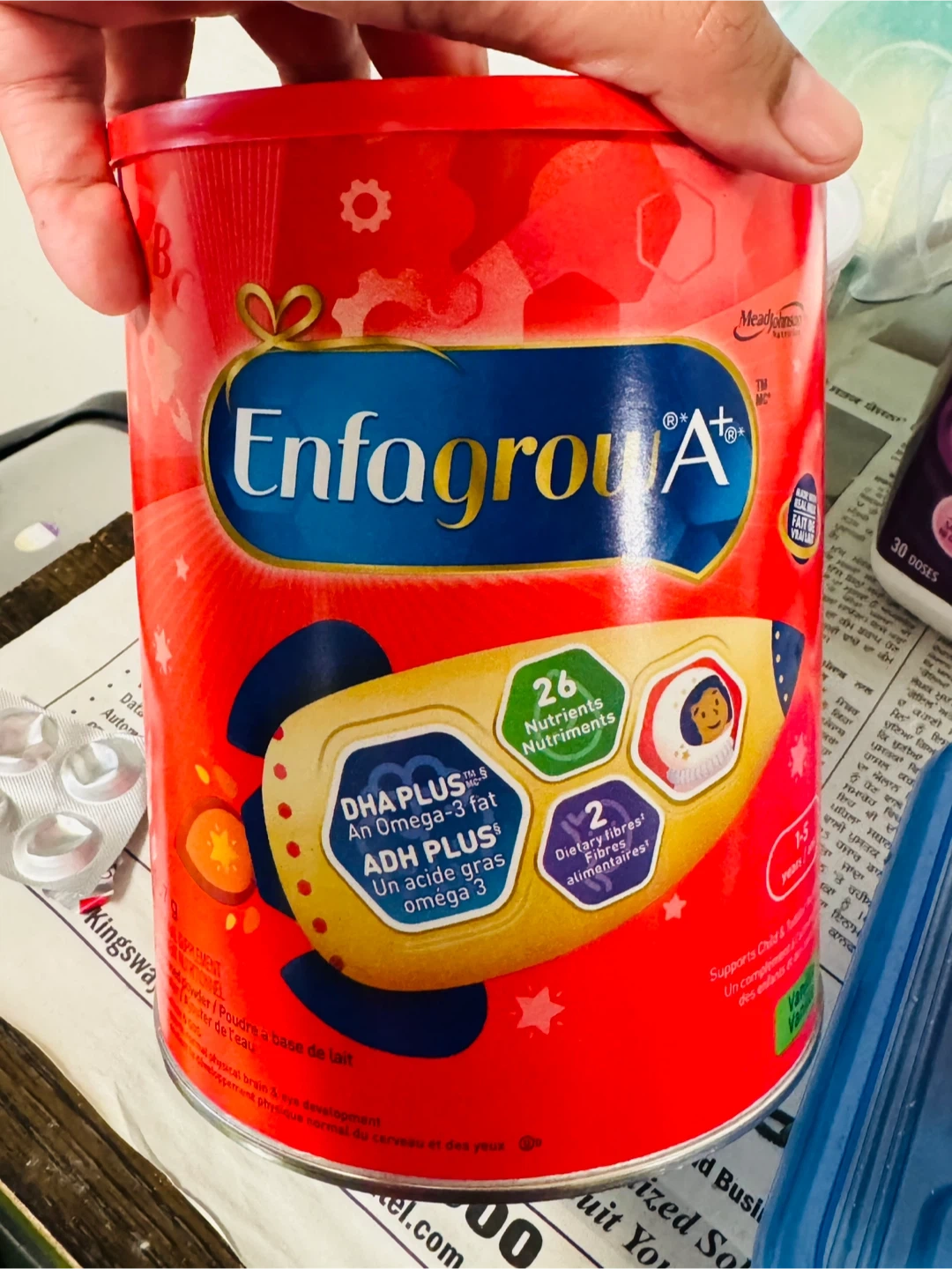This is Enfagrow A+ vanilla milk-based powder nutritional supplement. It contains 26 nutrients, including DHA and GOS. Recommended for children aged 1-5 years.