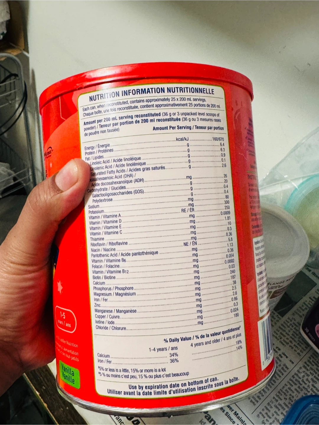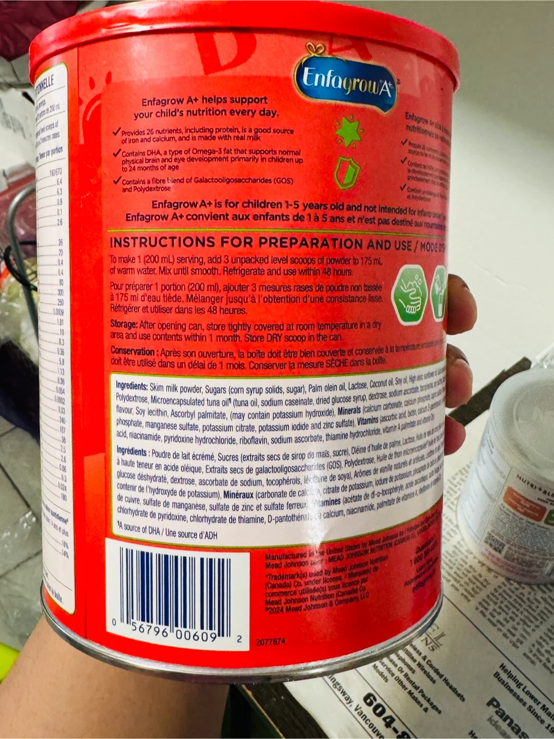 This is Enfagrow A+ vanilla milk-based powder nutritional supplement. It contains 26 nutrients, including DHA and GOS. Recommended for children aged 1-5 years.
