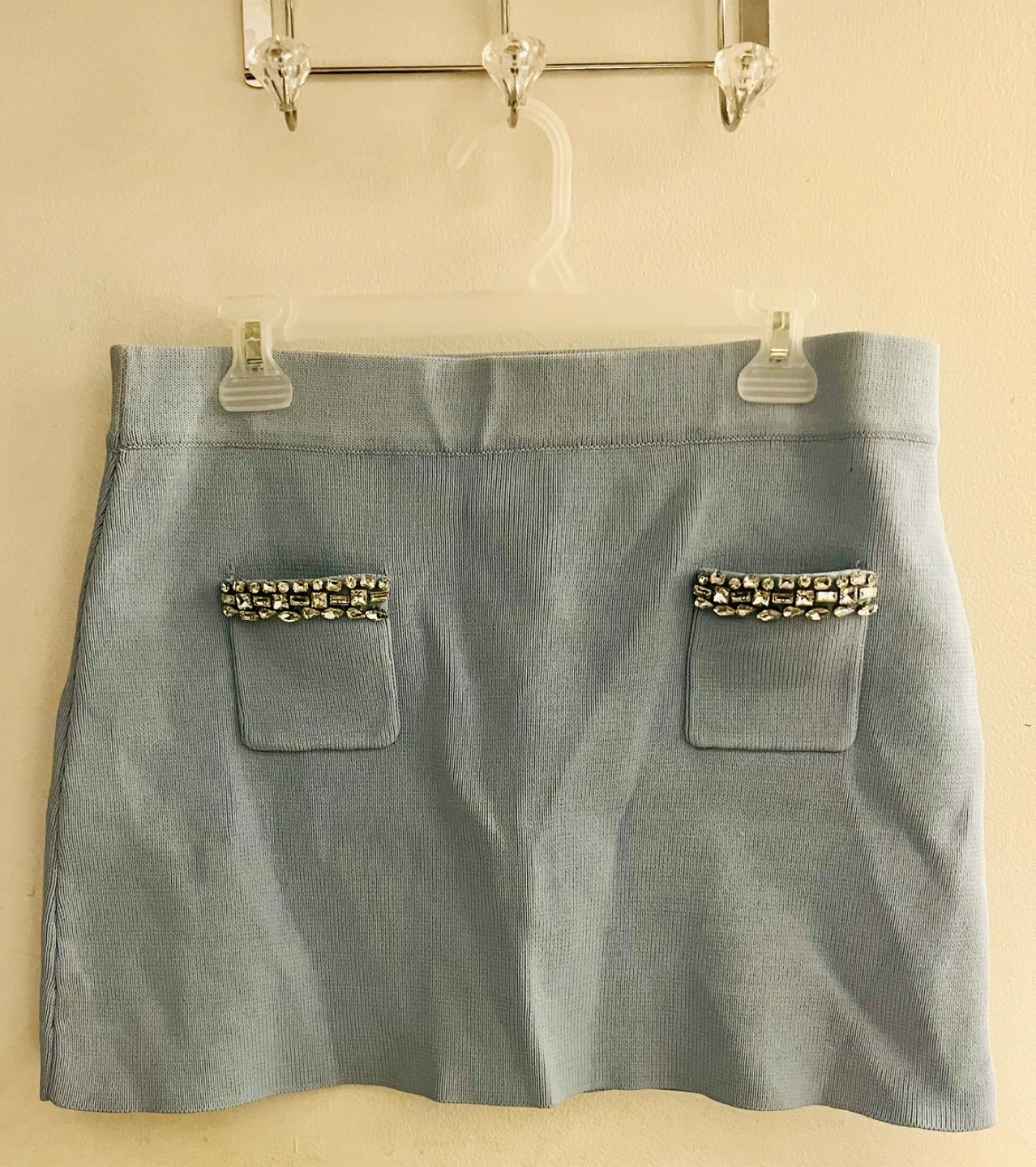 A cute light blue skirt featuring two decorative pockets adorned with rhinestones. It's made from a knit fabric. This skirt is a stylish addition to any wardrobe!
