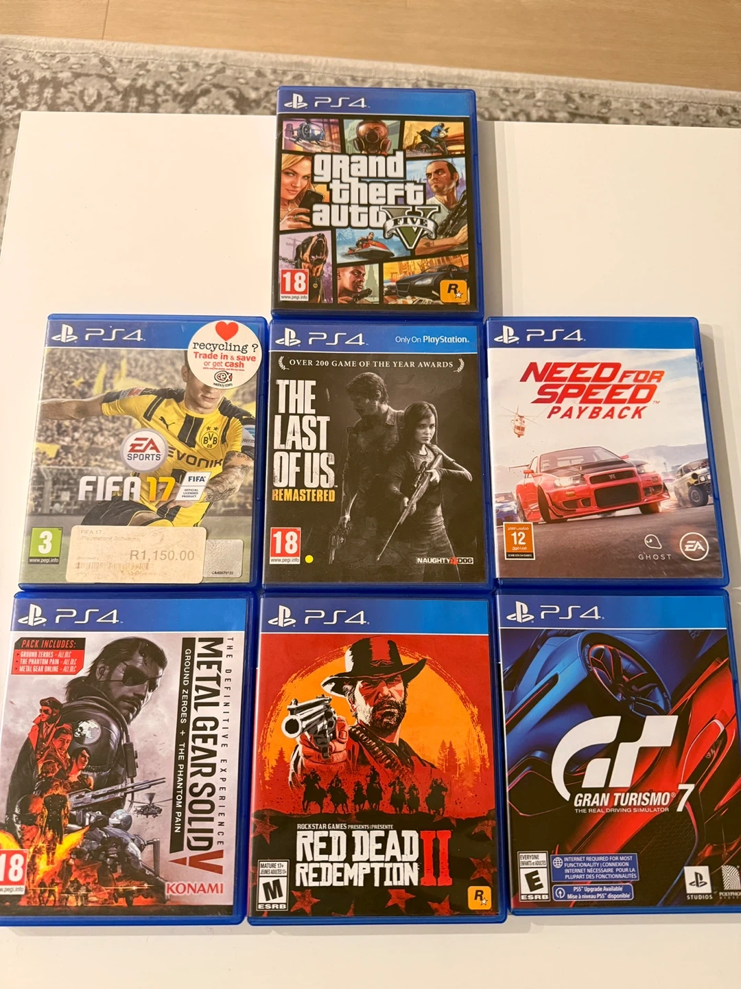 Bundle of 6 popular PlayStation 4 games. Includes Grand Theft Auto V, FIFA 17, The Last of Us Remastered, Need for Speed Payback, Metal Gear Solid V, and Red Dead Redemption II. Gran Turismo 7 is also included.