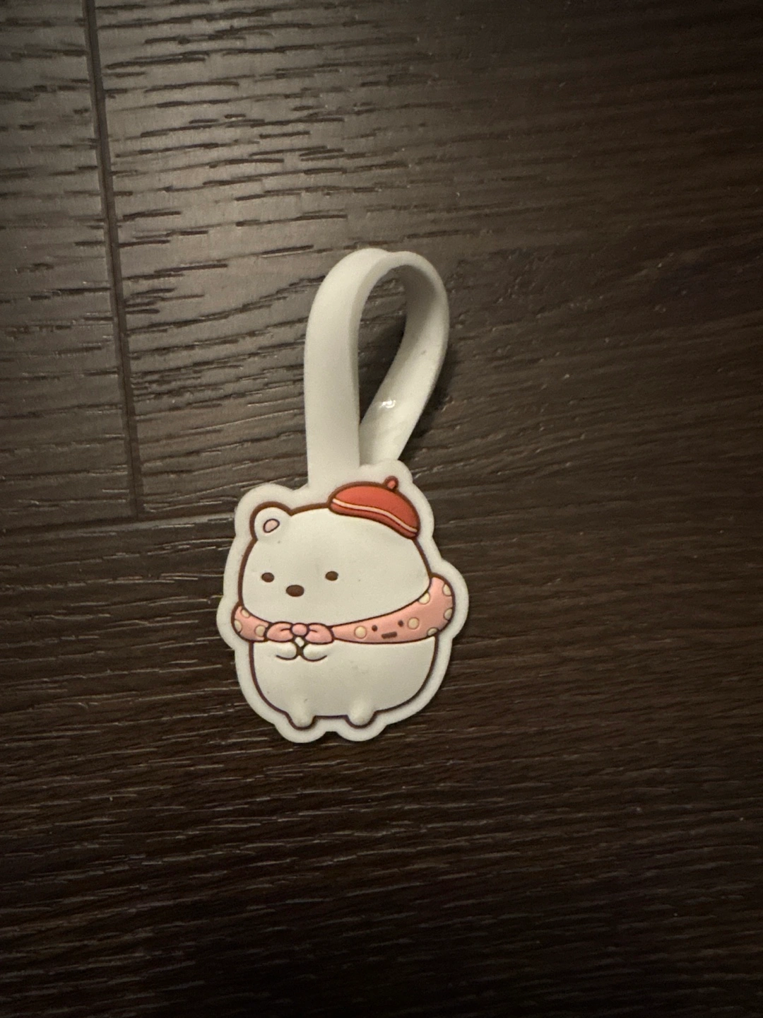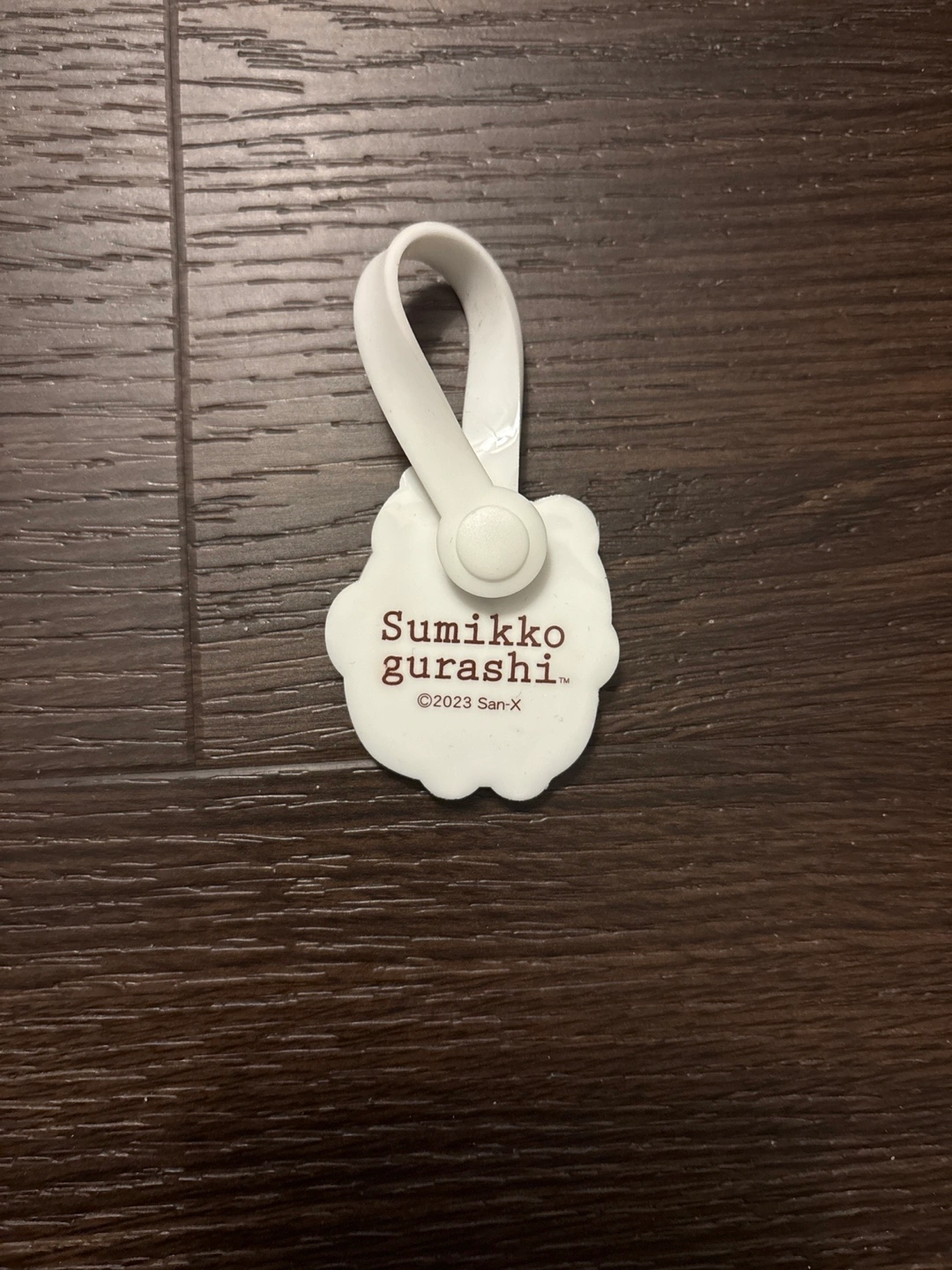 This is a white strap charm featuring a cute Sumikko Gurashi character. The charm is made of plastic and has a loop for attaching it. It's from the popular Sumikko Gurashi series, perfect for personalizing bags or keychains. The item was manufactured in 2023.