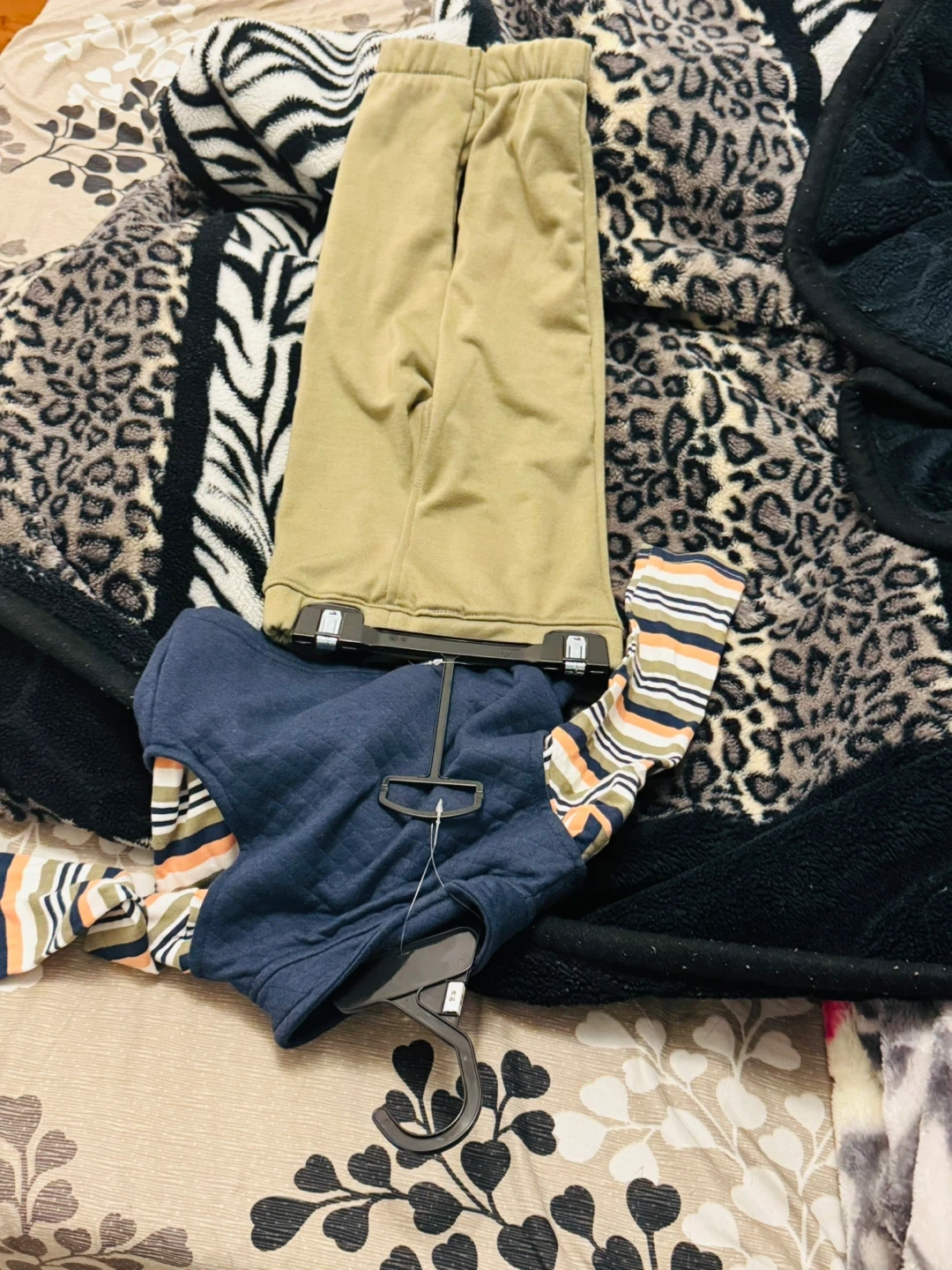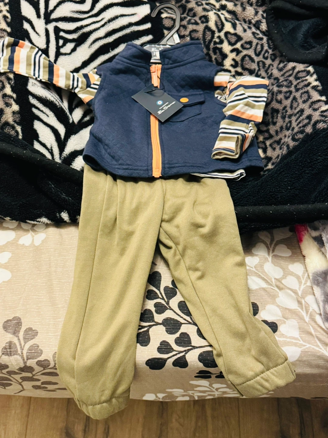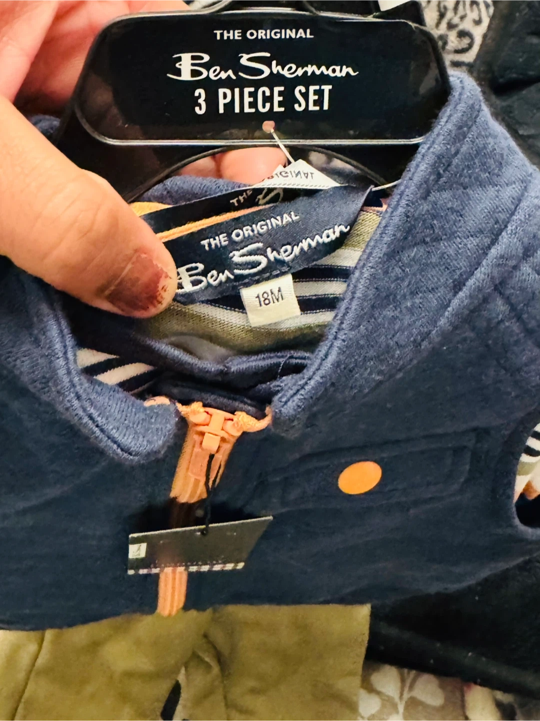 Ben Sherman 3-piece baby set with a quilted vest, striped long-sleeve shirt, and khaki pants. Size is 18 months. Vest is navy blue with an orange zipper.