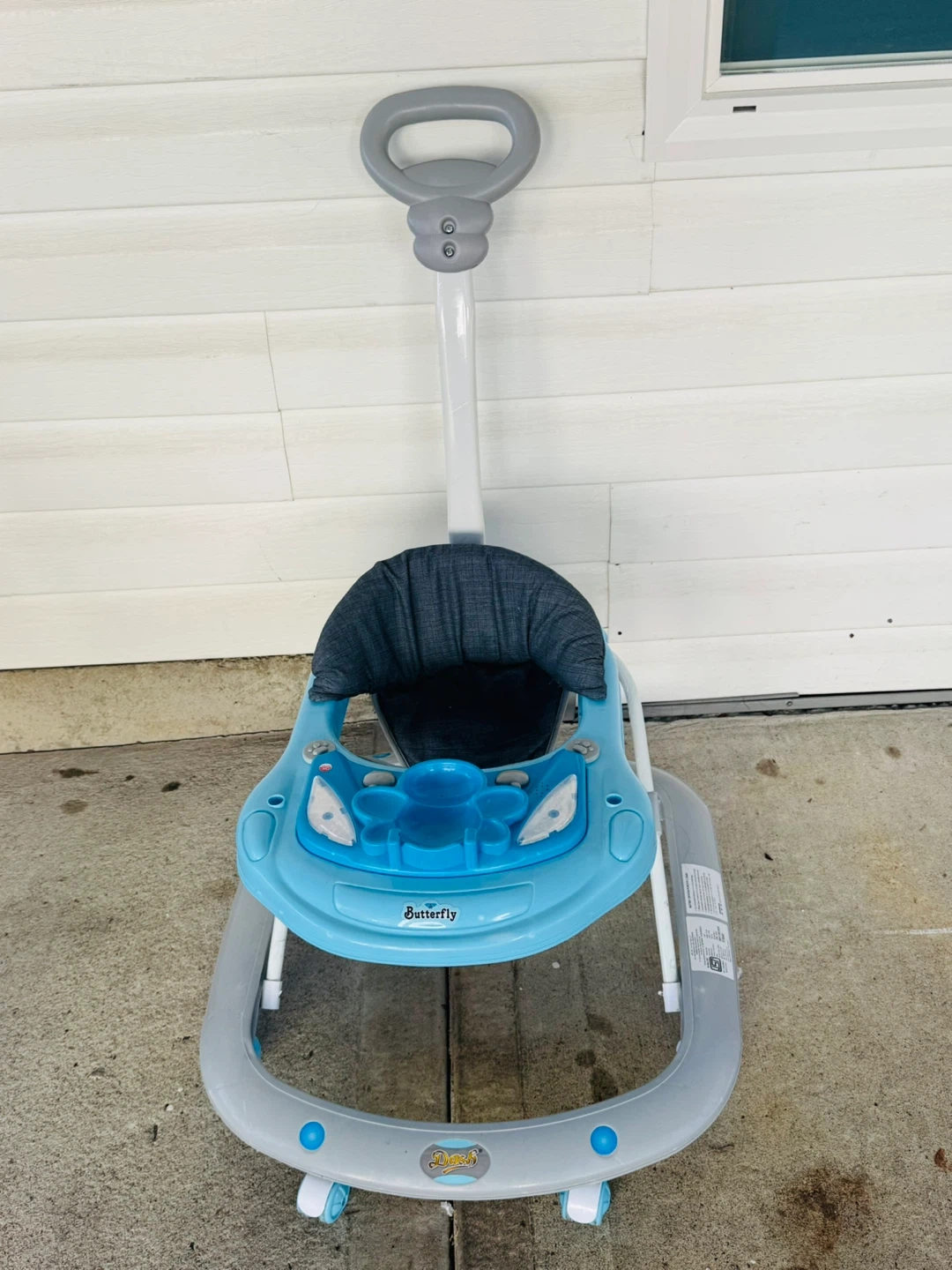 This blue baby walker features a cute butterfly design on the front tray. It has a padded seat and a push handle for adult supervision. The tray includes interactive elements for baby's entertainment.