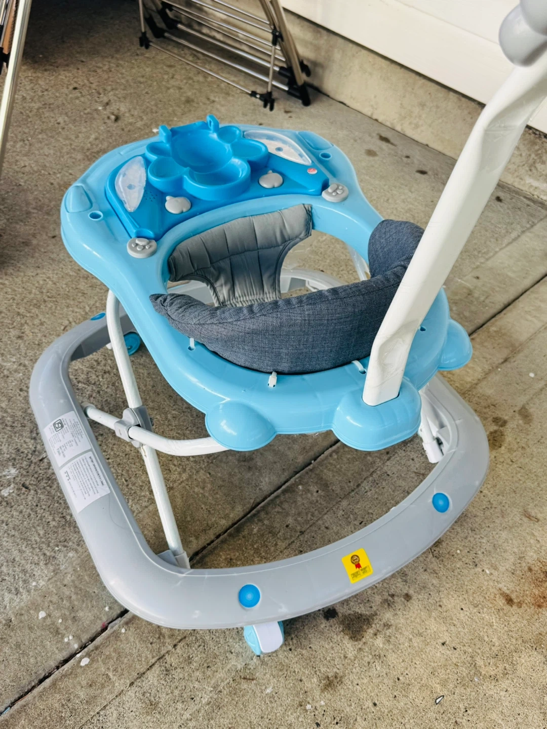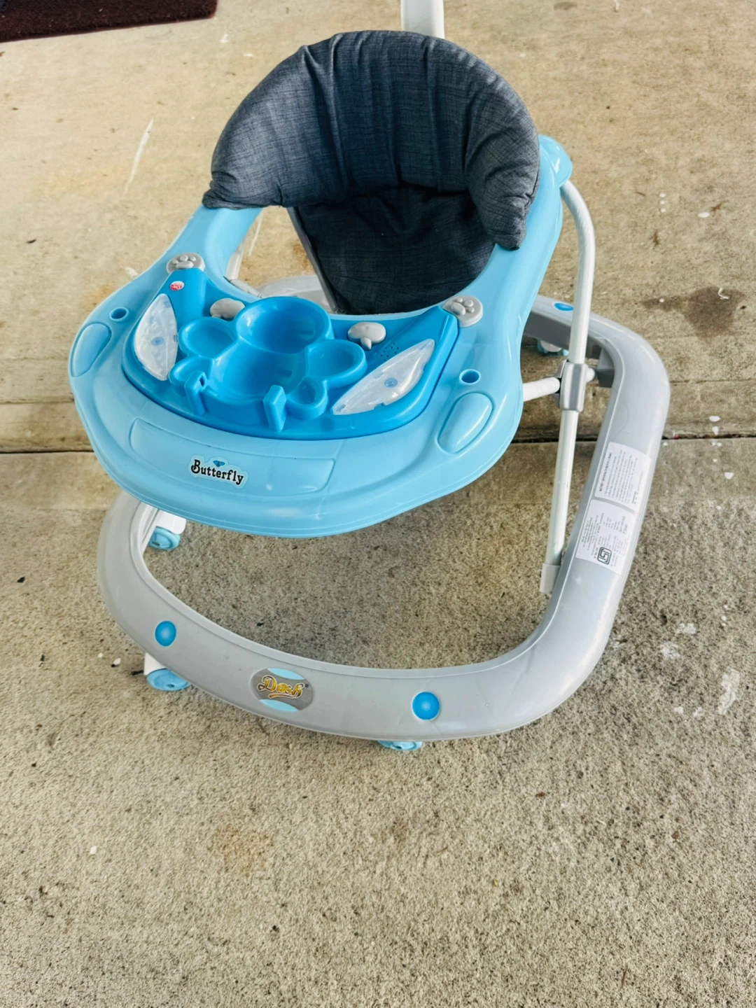This blue baby walker features a cute butterfly design on the front tray. It has a padded seat and a push handle for adult supervision. The tray includes interactive elements for baby's entertainment.