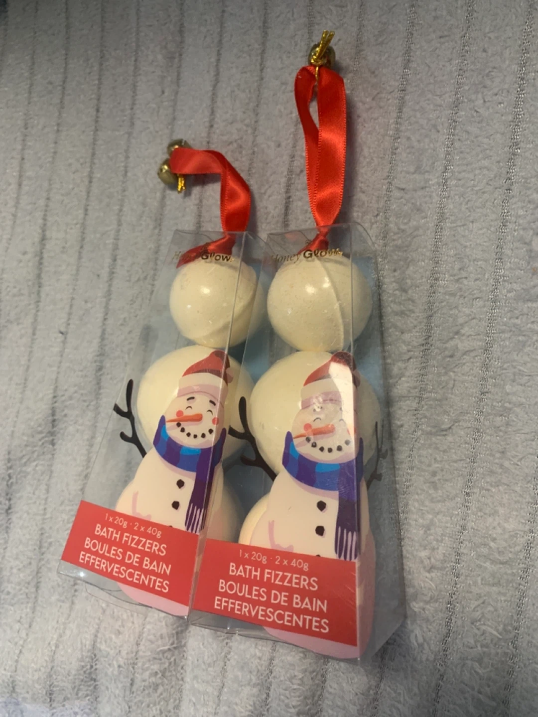 Two bath fizzers shaped like snowmen. Each package contains 2 SETS x 40g bath fizzers, for a total of 80g per package. They're perfect for a relaxing holiday bath!