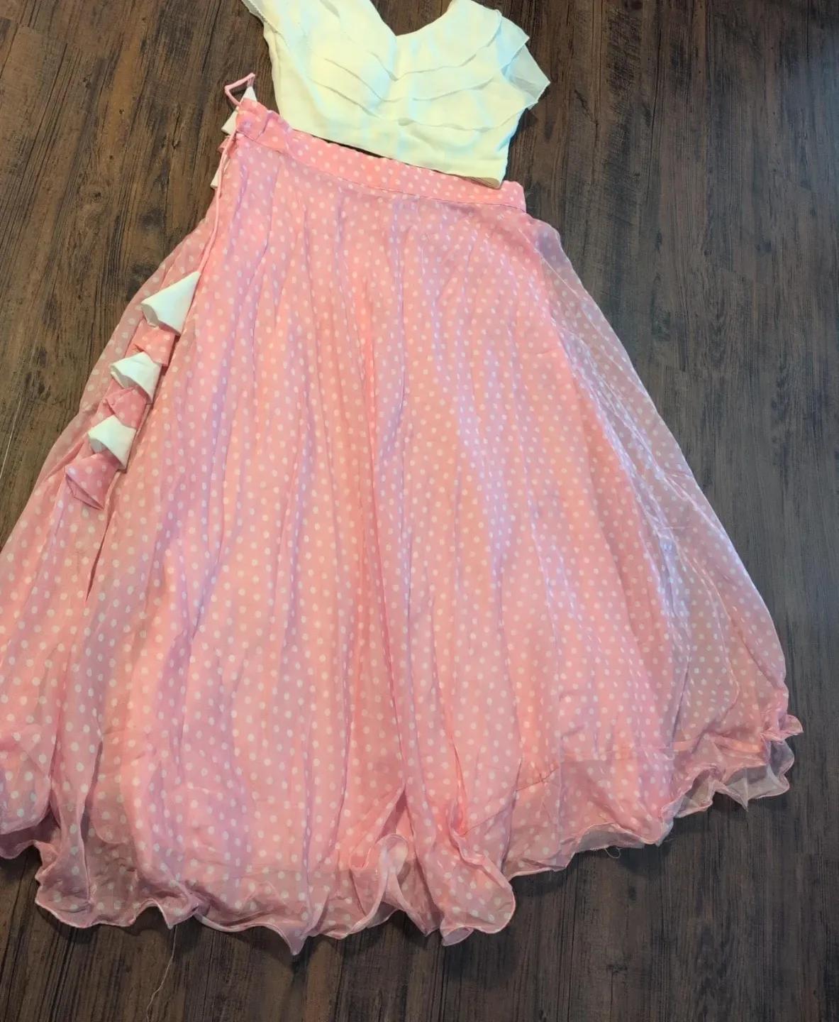 This is a pretty pink polka dot skirt with a matching white ruffle-top. The skirt has a light, flowy material and features decorative white bow accents along the side. The top has a V-neck with ruffled detailing. It's a lovely two-piece outfit!