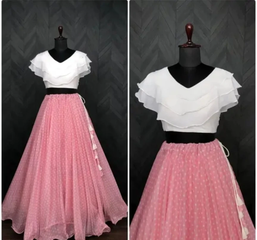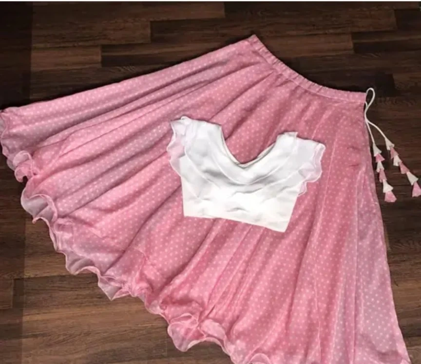 This is a pretty pink polka dot skirt with a matching white ruffle-top. The skirt has a light, flowy material and features decorative white bow accents along the side. The top has a V-neck with ruffled detailing. It's a lovely two-piece outfit!