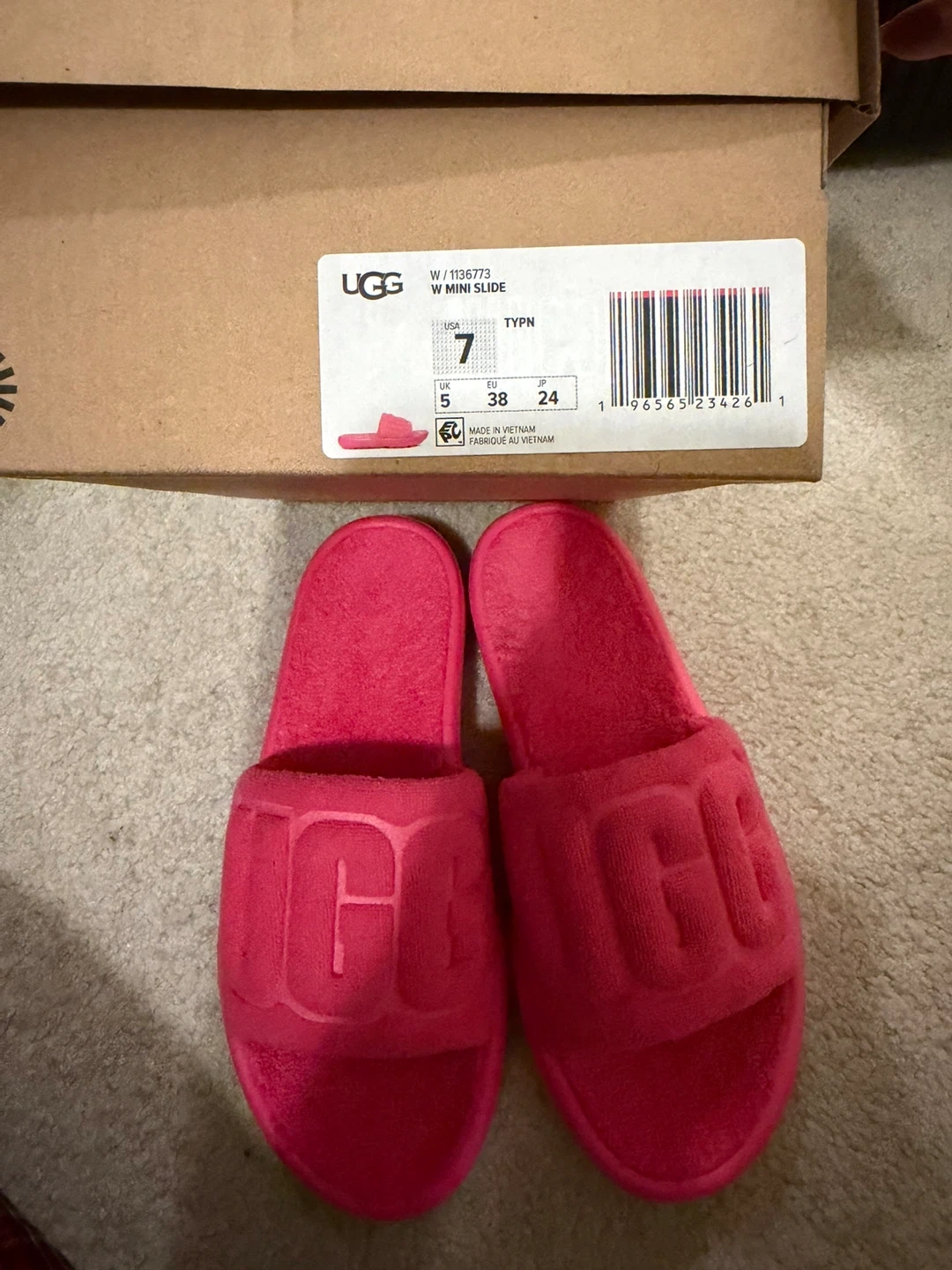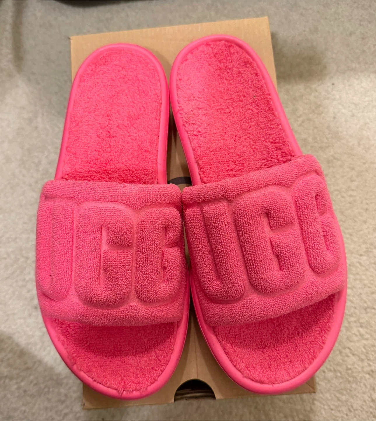 UGG W Fluff Yeah Slides in a vibrant hot pink. These open-toe sandals feature a soft terrycloth upper with the UGG logo embossed across the vamp. Made in Vietnam. Includes original box. Great for lounging!