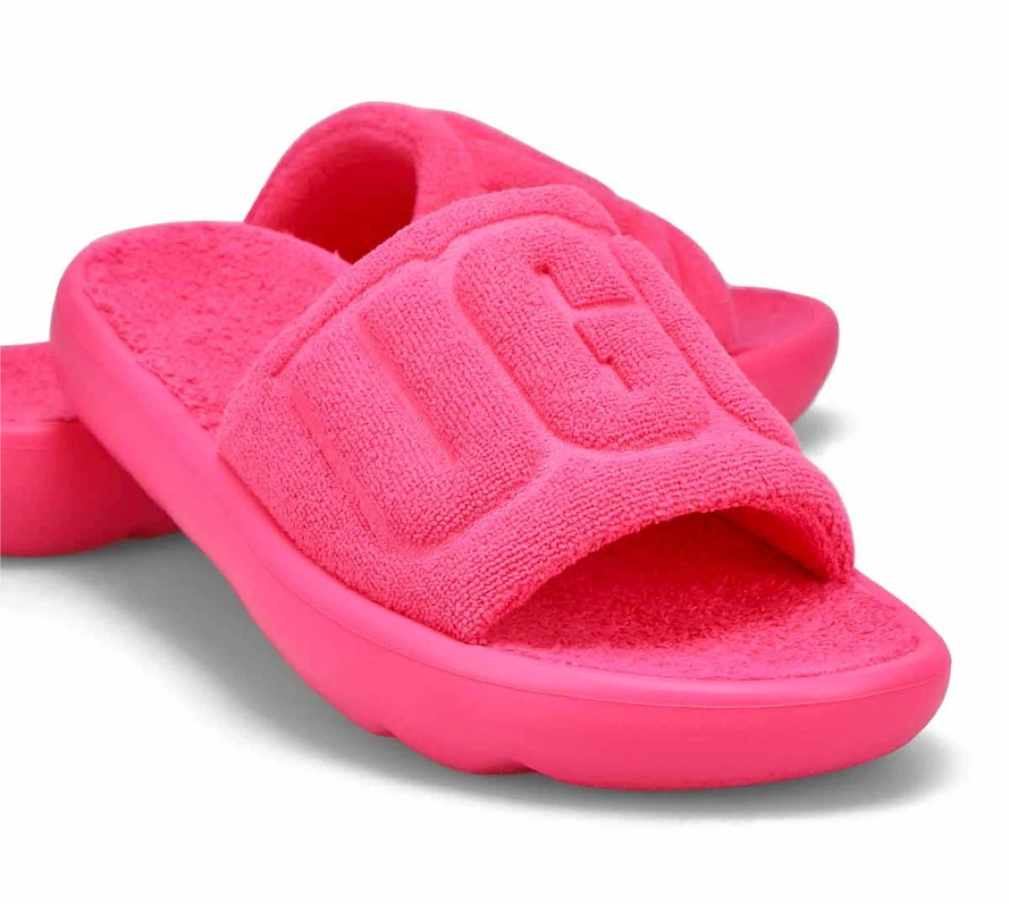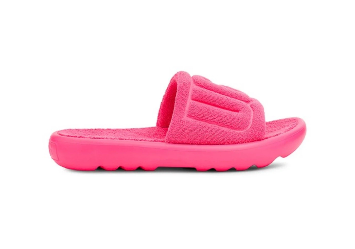 UGG W Fluff Yeah Slides in a vibrant hot pink. These open-toe sandals feature a soft terrycloth upper with the UGG logo embossed across the vamp. Made in Vietnam. Includes original box. Great for lounging!