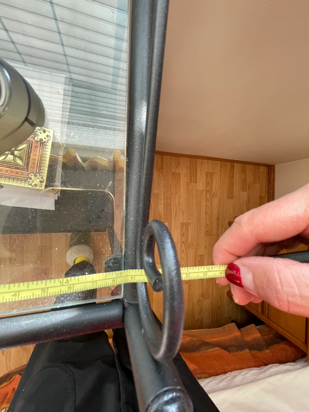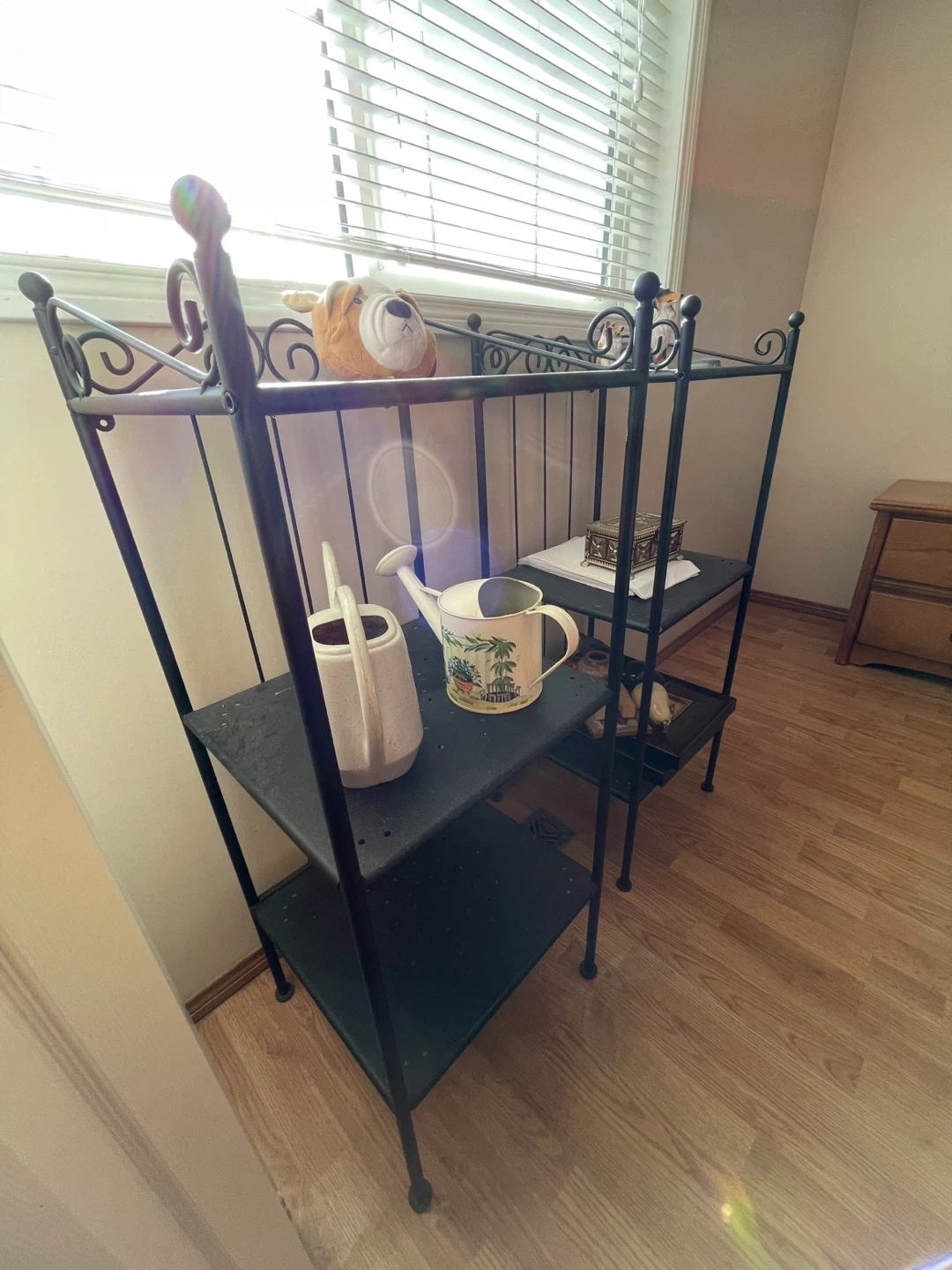 Two-tier black metal plant stand with decorative scrollwork and glass shelves. It's about 40 inches tall and 15 inches wide. This rack is suitable for kitchens or small spaces. It holds items like pots, pans, or decorative pieces.
