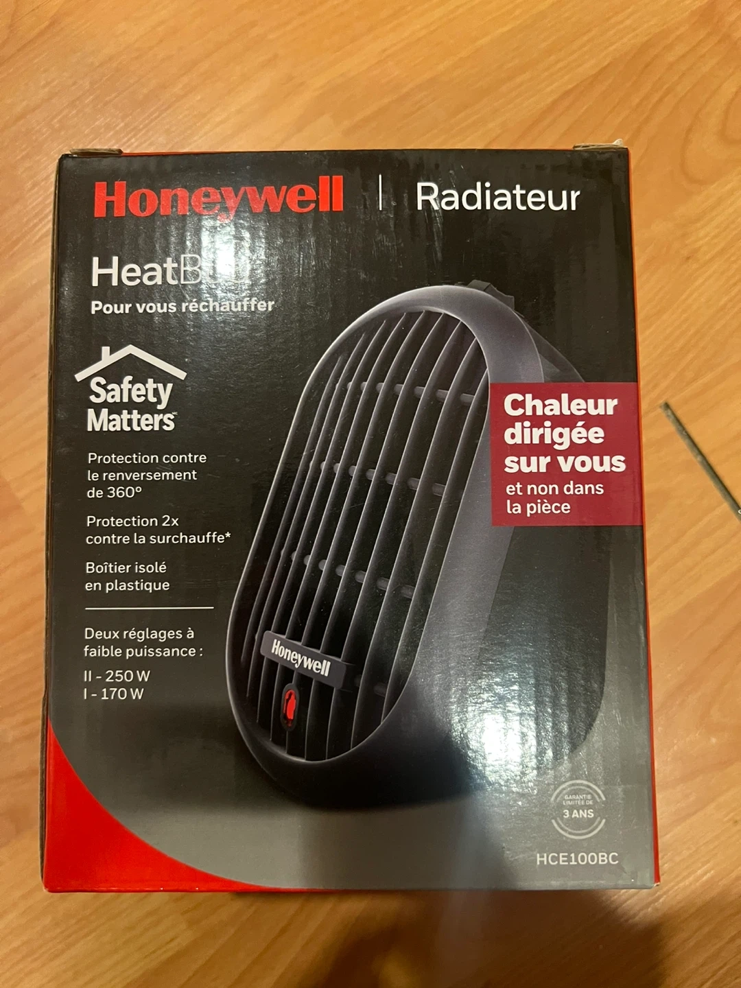 This Honeywell HeatBud personal heater is designed for focused warmth. It features 360° tip-over protection and 2x overheat protection for safety. The unit has two low wattage settings: 250 W and 170 W.