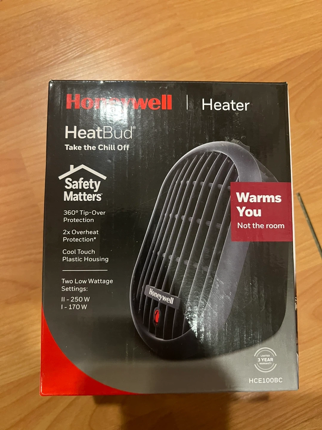This Honeywell HeatBud personal heater is designed for focused warmth. It features 360° tip-over protection and 2x overheat protection for safety. The unit has two low wattage settings: 250 W and 170 W.
