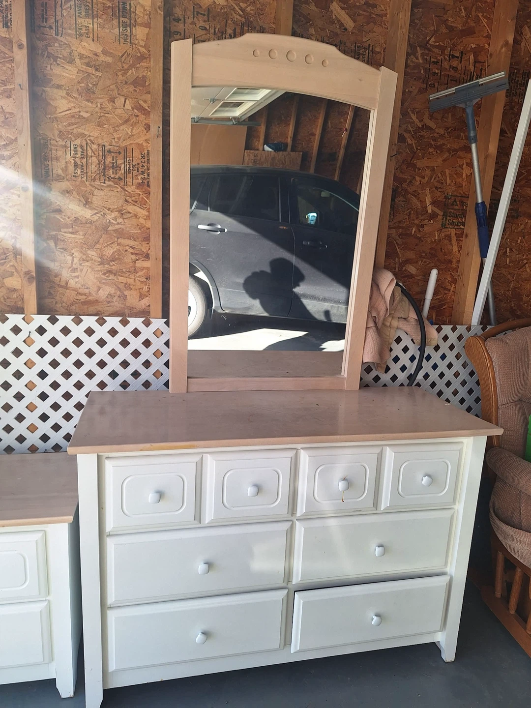 Solid wood white dresser with a light wood top and a matching mirror. It features six drawers for storage. This dresser would be great for a bedroom or nursery.