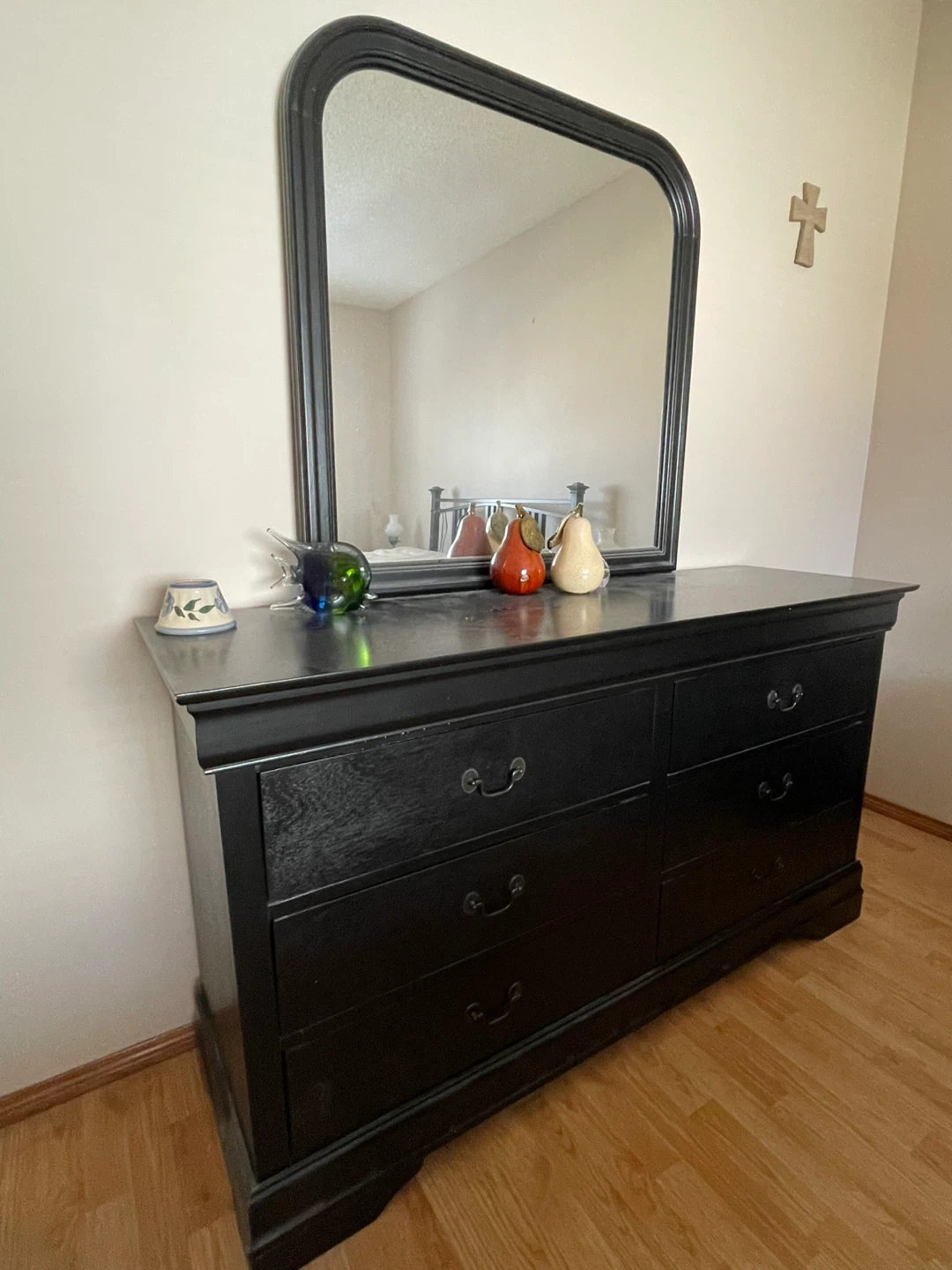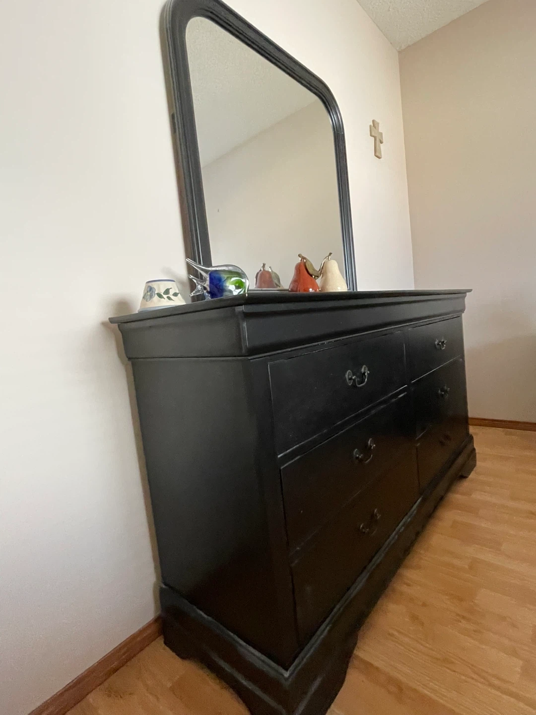 This classic solid black wood dresser is a solid wood dresser with six drawers and a mirror, black with classic drawer pulls. They're made of solid wood. This durable furniture would suit any bedroom.