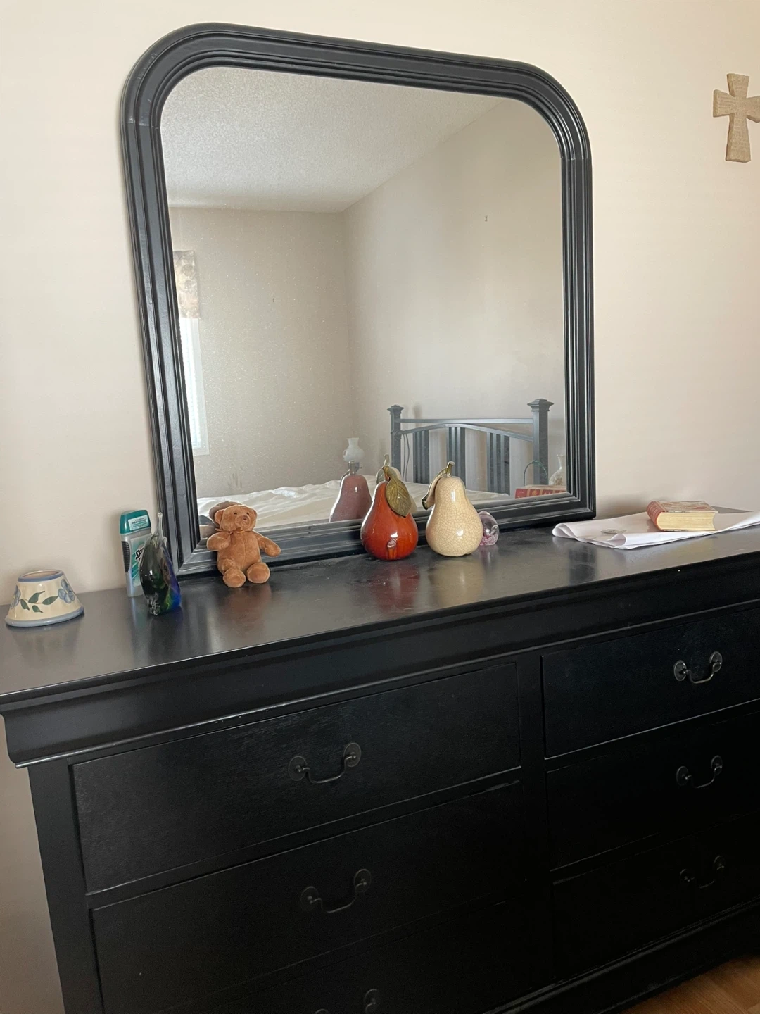 This classic solid black wood dresser is a solid wood dresser with six drawers and a mirror, black with classic drawer pulls. They're made of solid wood. This durable furniture would suit any bedroom.