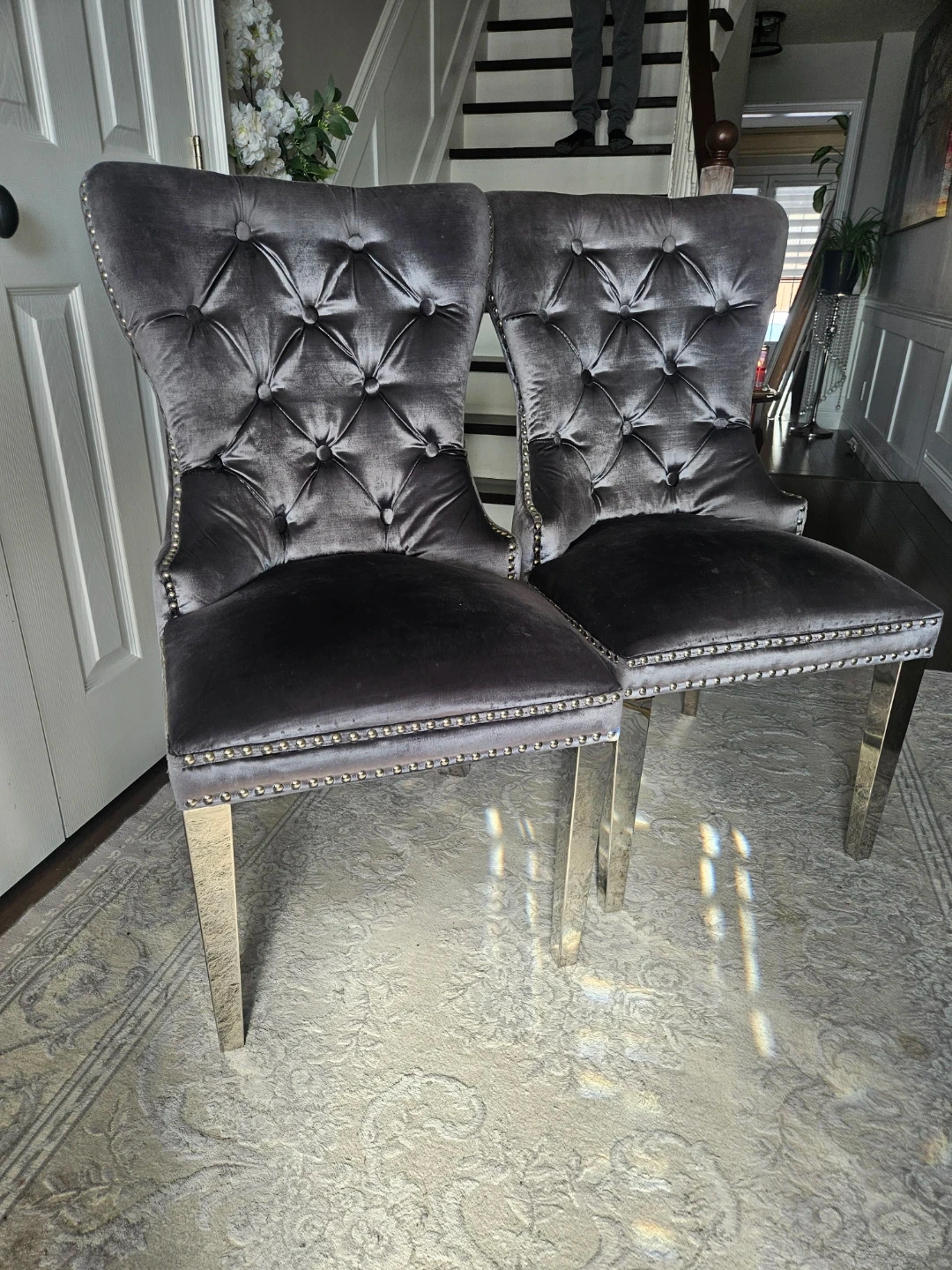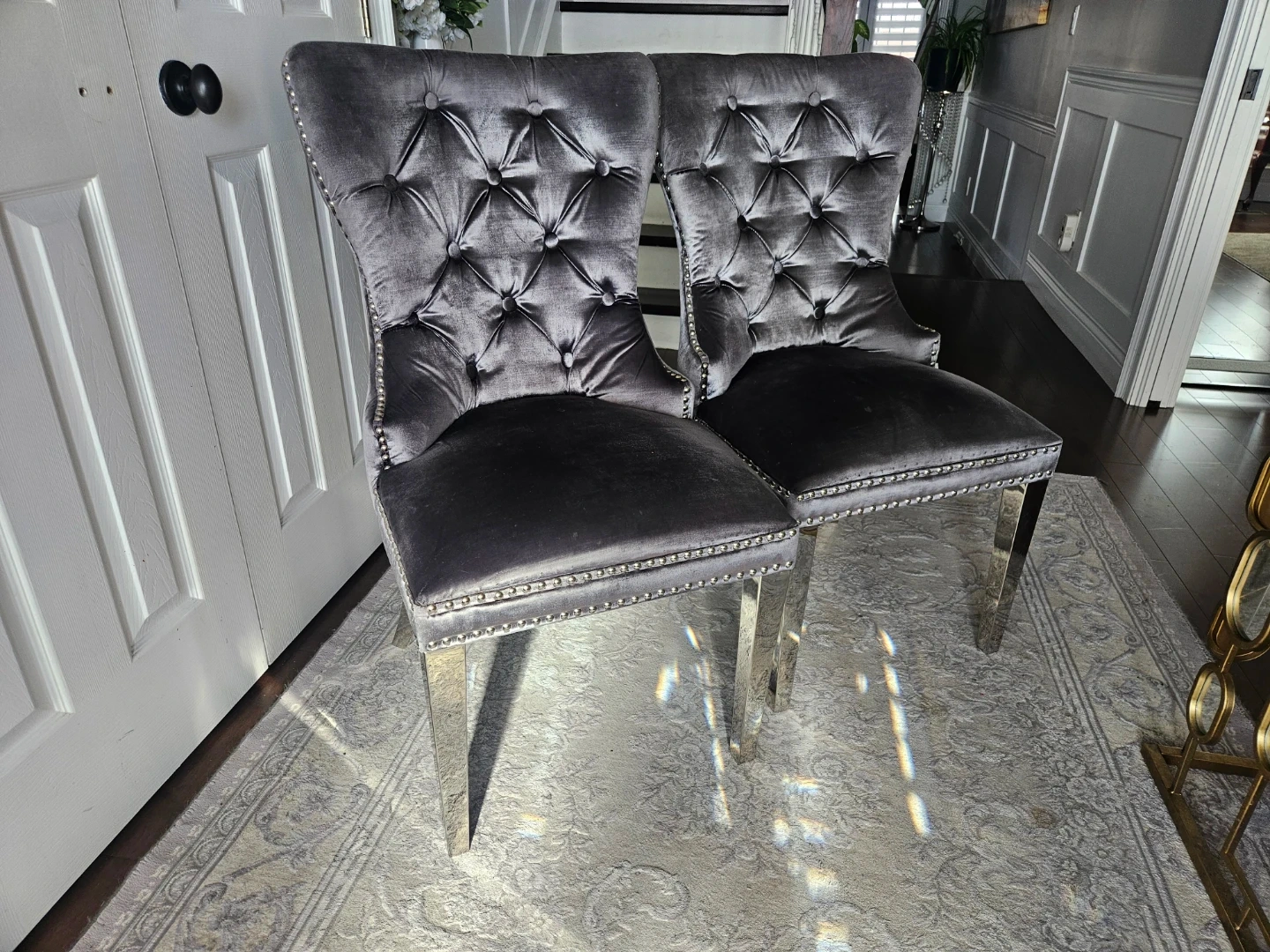 These dining chairs are upholstered in soft grey velvet fabric with tufted detailing. They feature silver nailhead trim and sturdy metallic legs. Seat height is 20 inches.