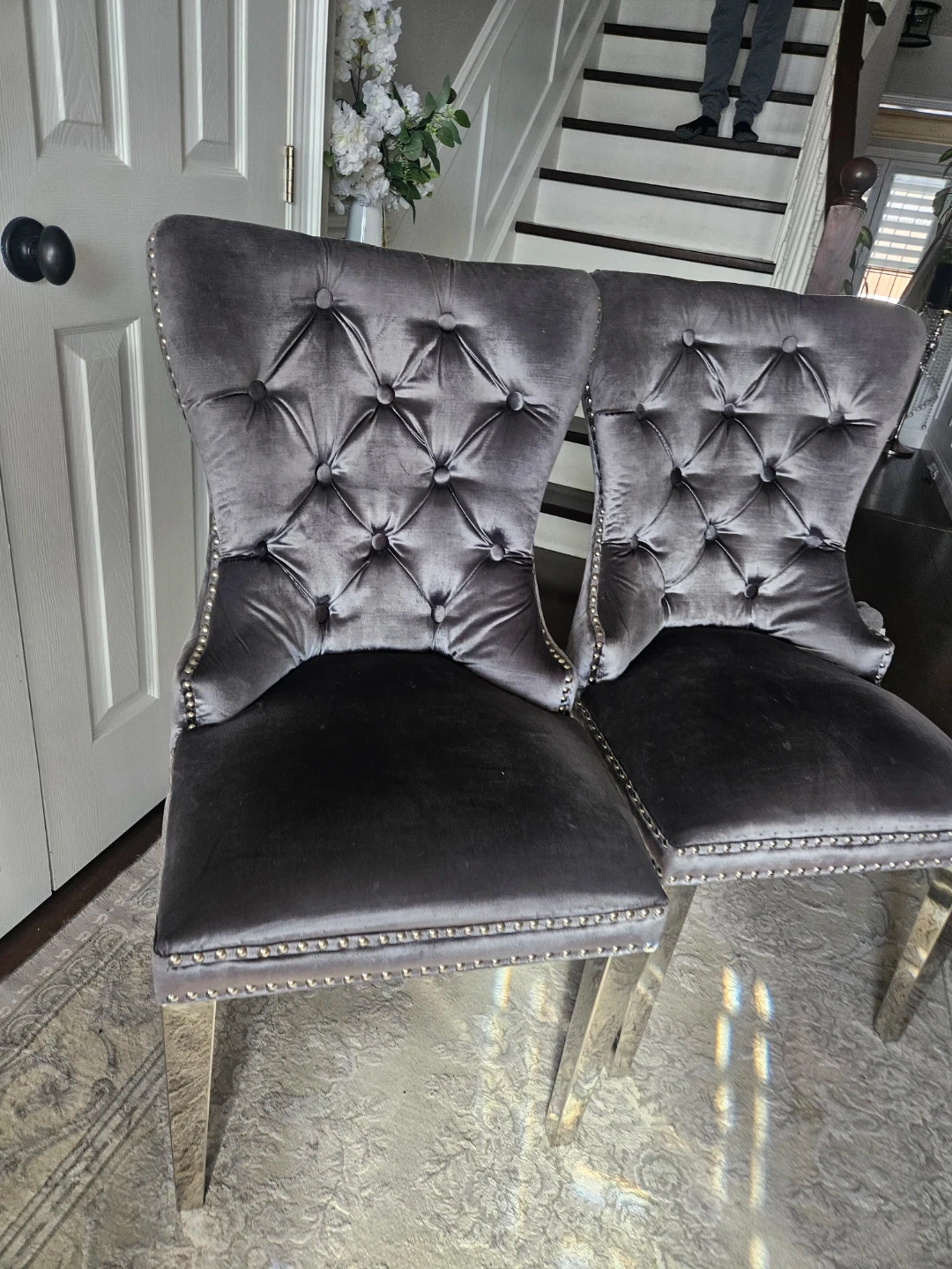 These dining chairs are upholstered in soft grey velvet fabric with tufted detailing. They feature silver nailhead trim and sturdy metallic legs. Seat height is 20 inches.