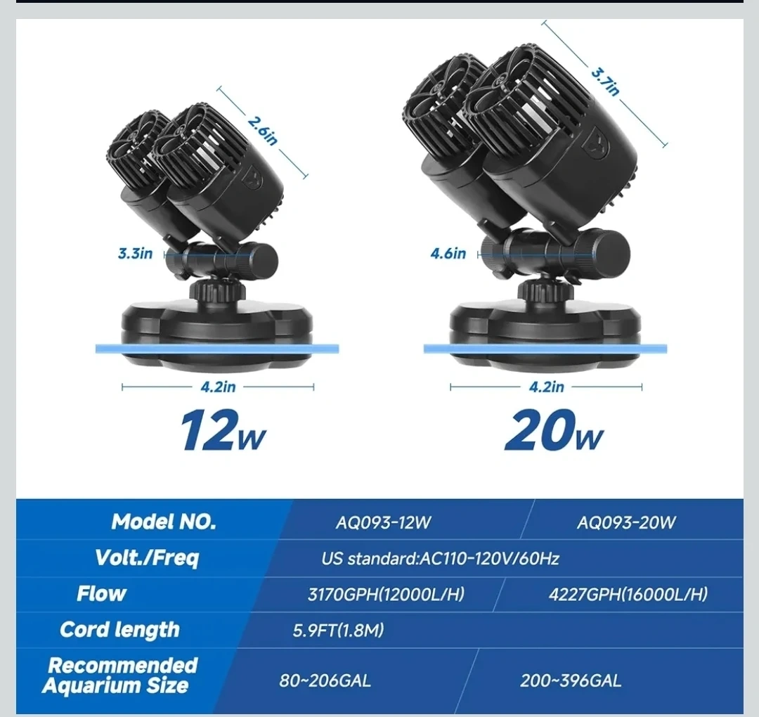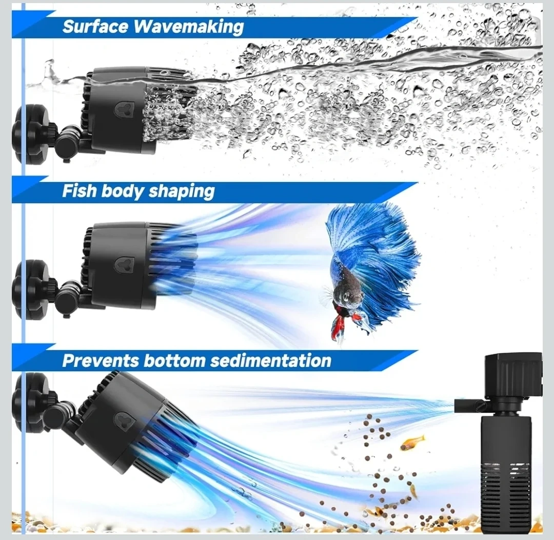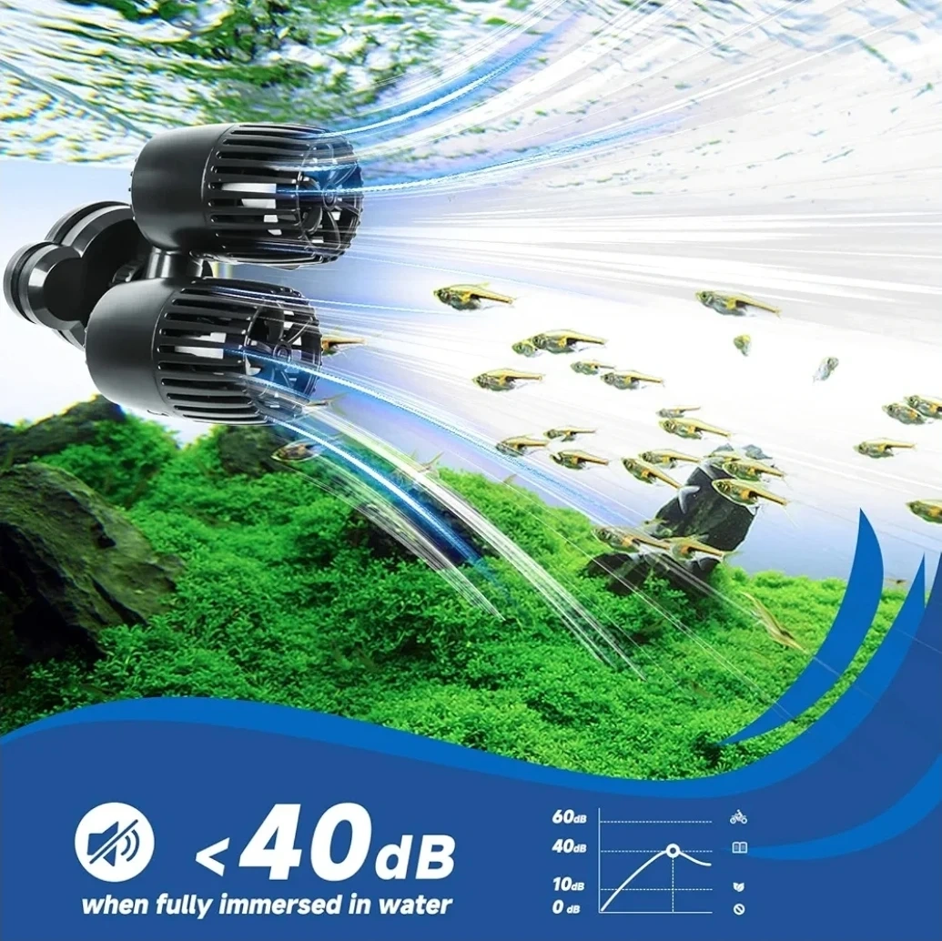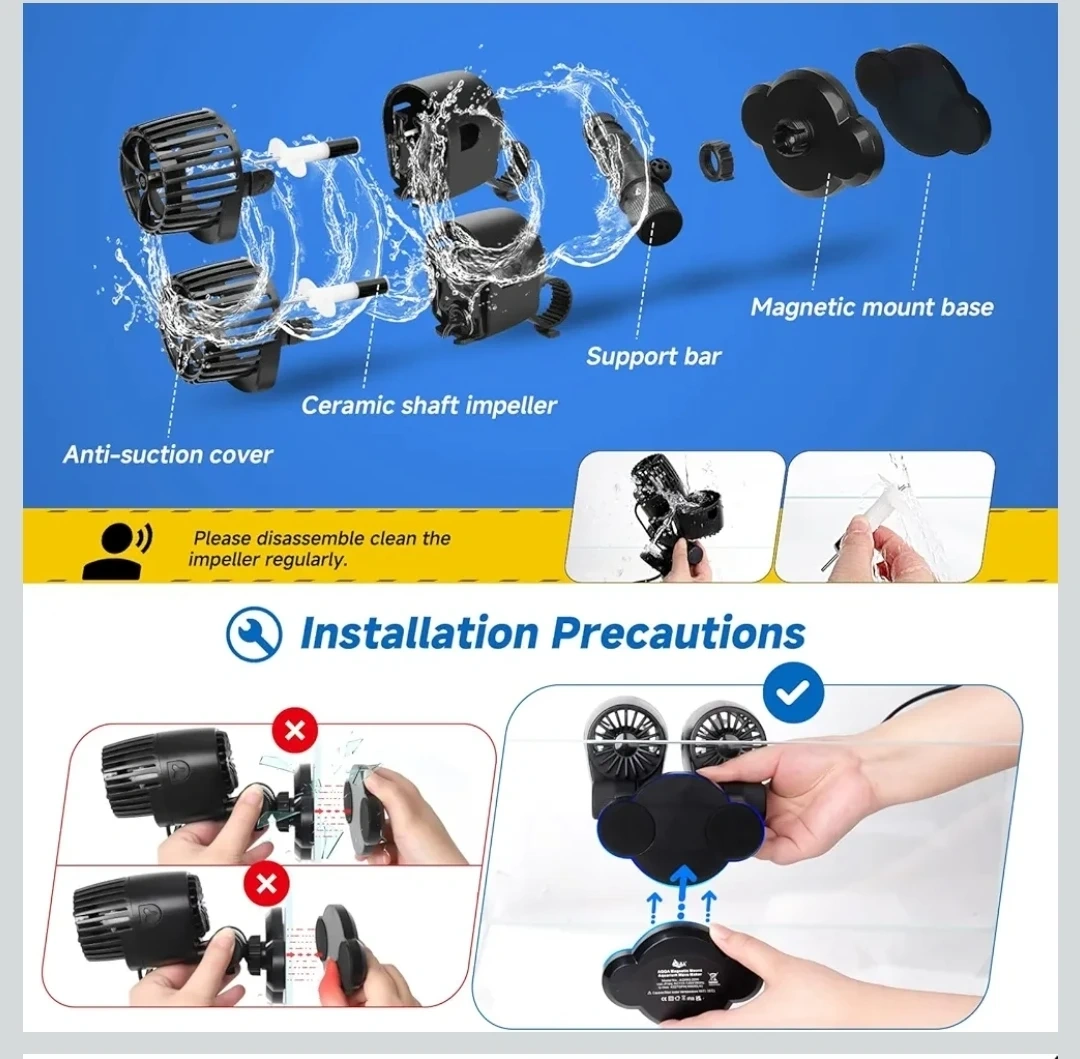 This AQQA wave maker creates surface wavestorming, fish body shaping, and prevents bottom sedimentation. It features 360° rotation for the overall powerhead and 180° rotation for a single powerhead. Suitable for both freshwater and saltwater aquariums.