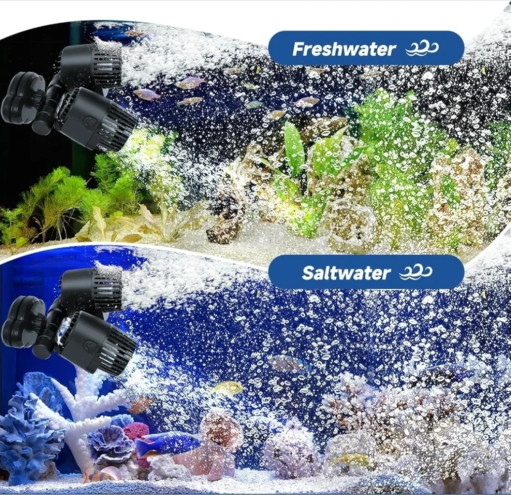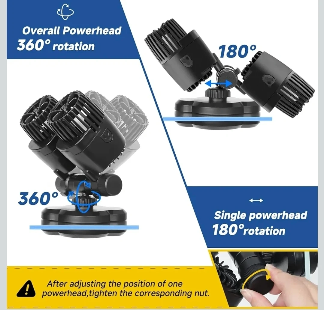 This AQQA wave maker creates surface wavestorming, fish body shaping, and prevents bottom sedimentation. It features 360° rotation for the overall powerhead and 180° rotation for a single powerhead. Suitable for both freshwater and saltwater aquariums.