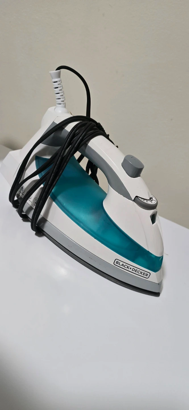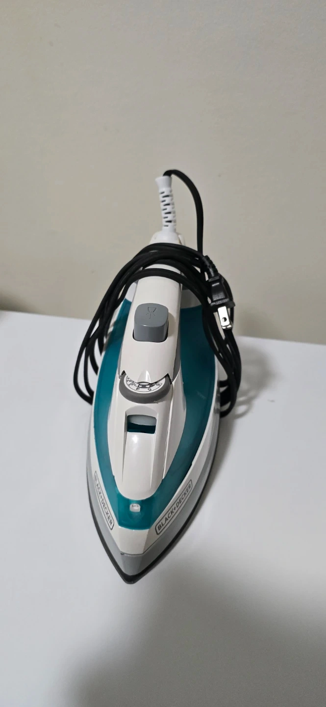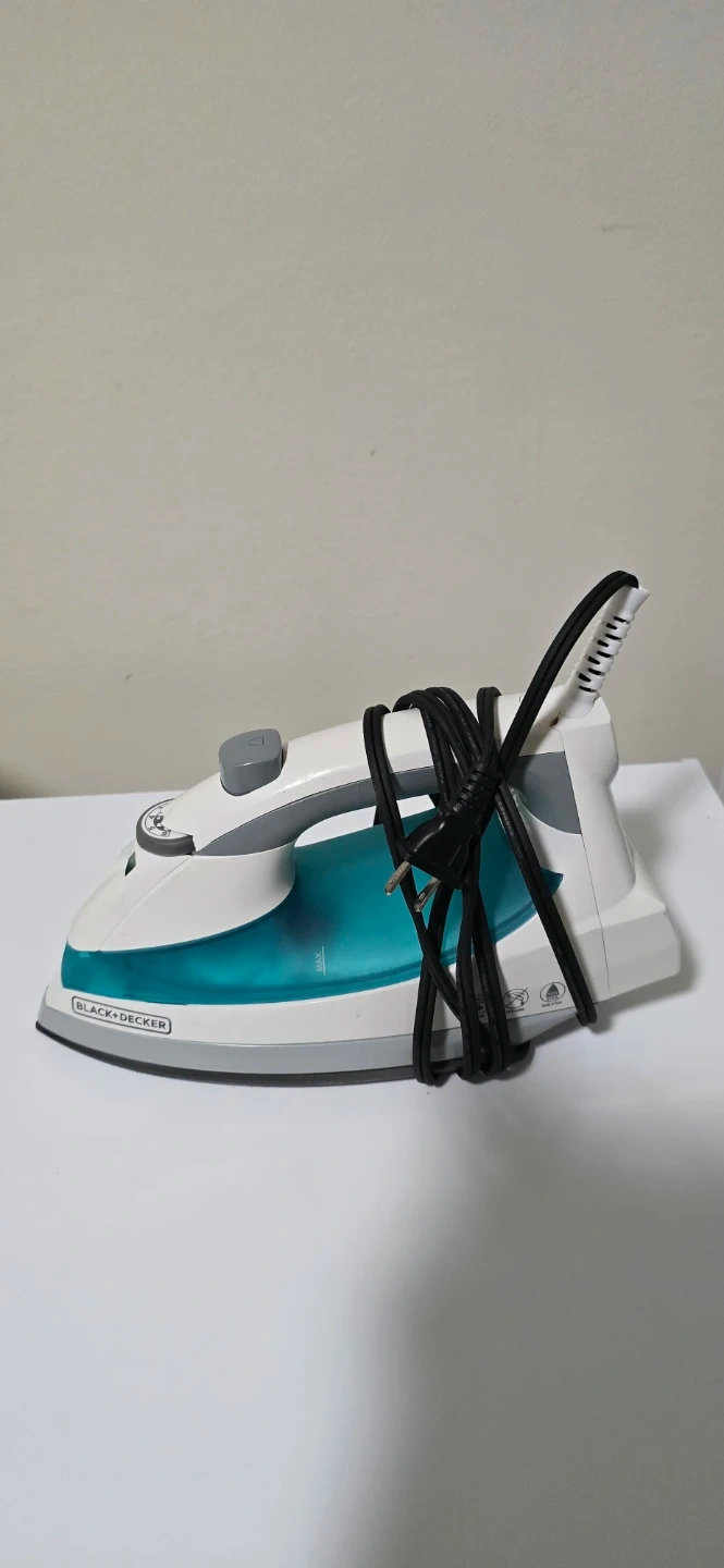 This is a BLACK+DECKER iron. It has a turquoise water reservoir and a white and grey body. Cord wraps around the iron for storage.