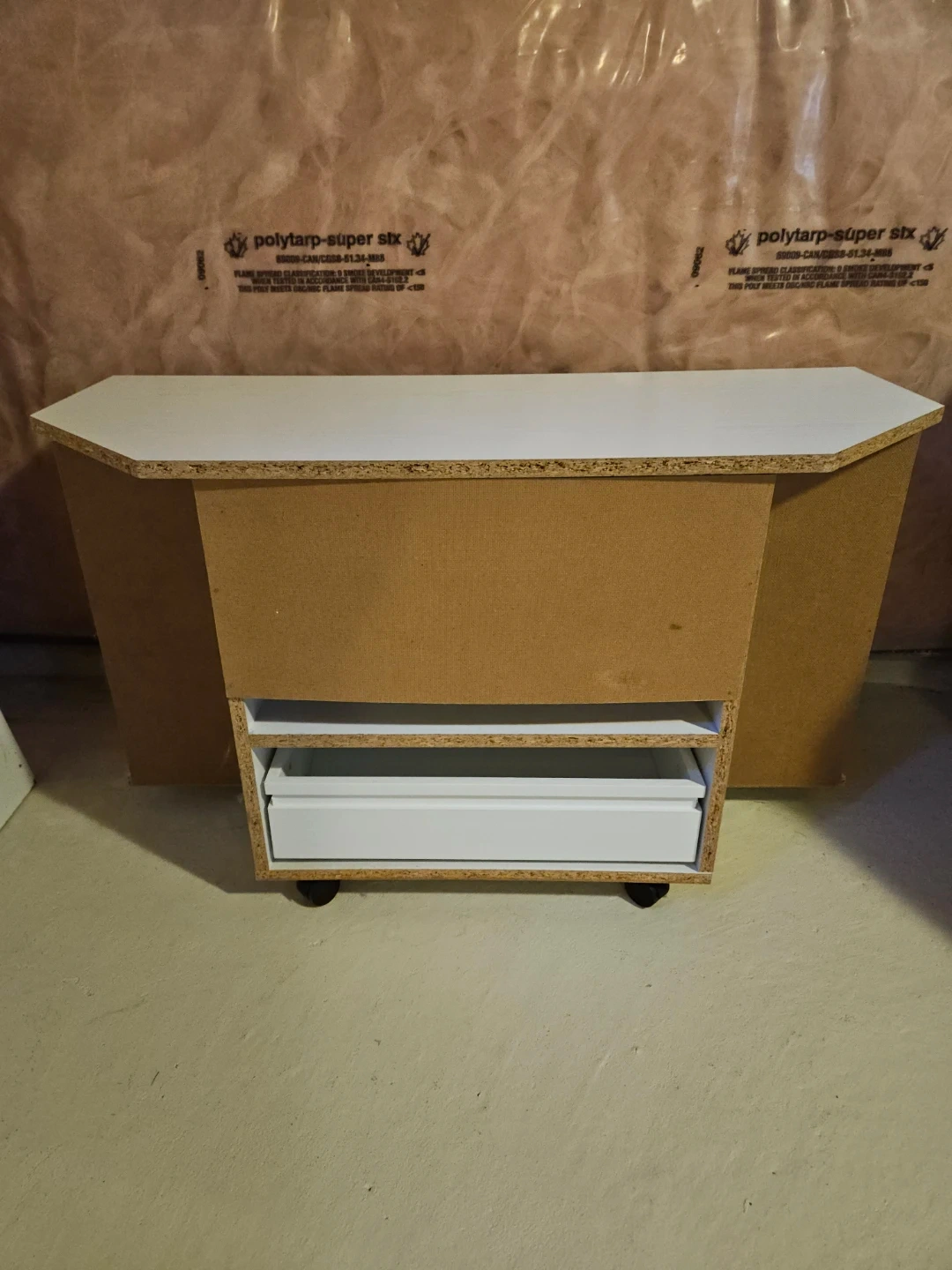 Used white corner TV stand with glass doors (on wheels). Could be used along a straight wall as well. In very good used condition. Approx 35 1/2" W x 15 1/4" D x 20 1/4" H.