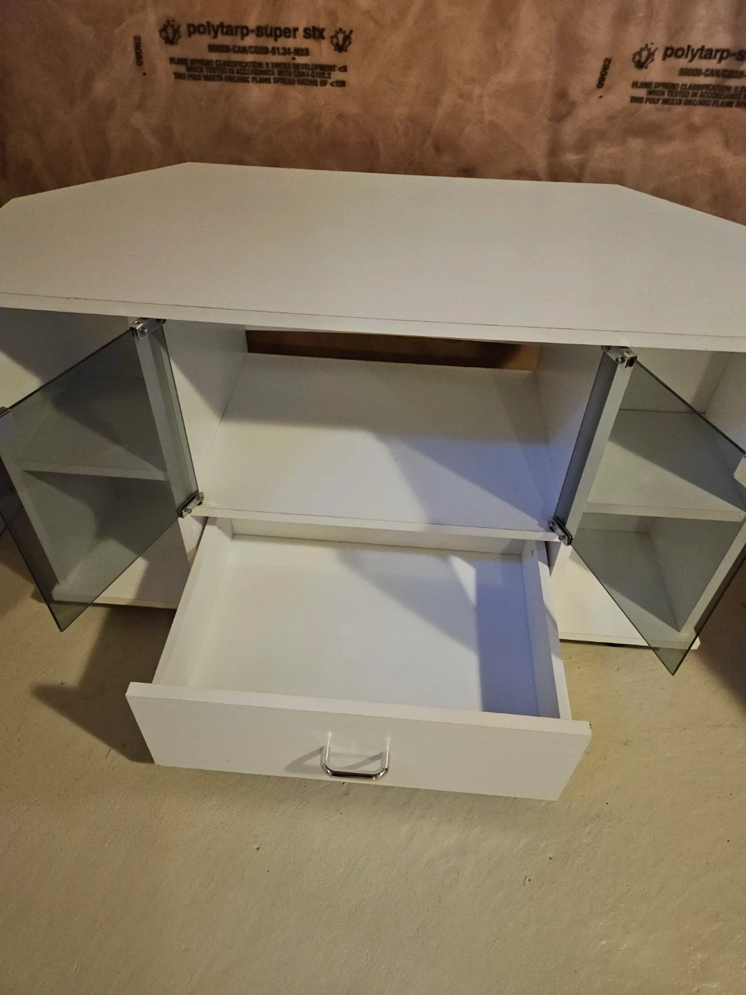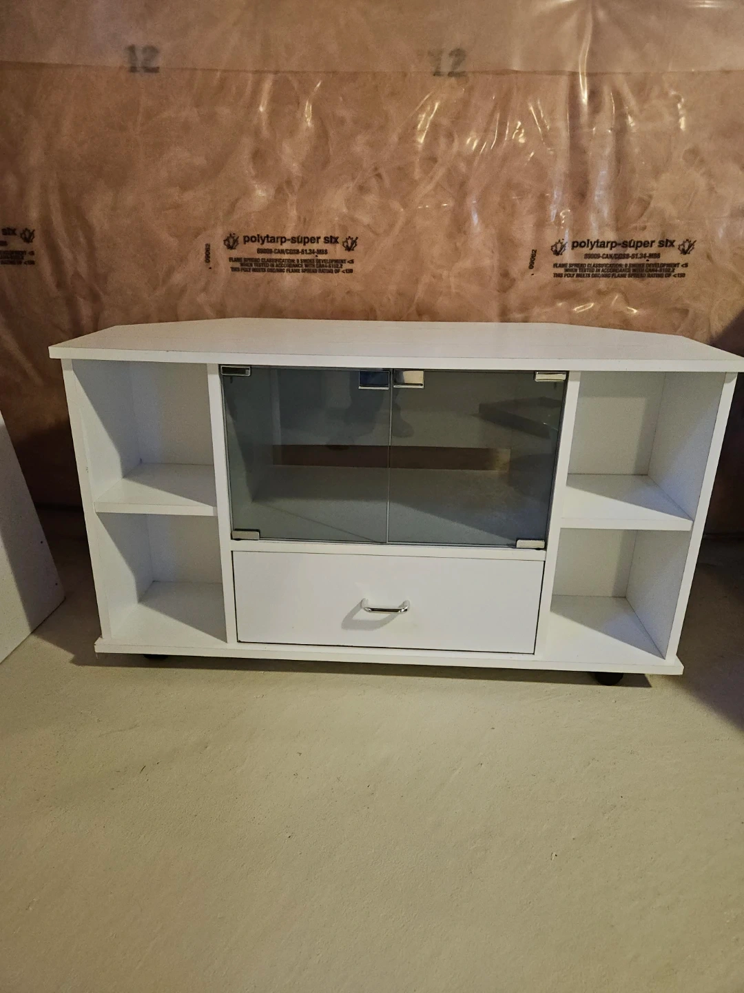 Used white corner TV stand with glass doors (on wheels). Could be used along a straight wall as well. In very good used condition. Approx 35 1/2" W x 15 1/4" D x 20 1/4" H.
