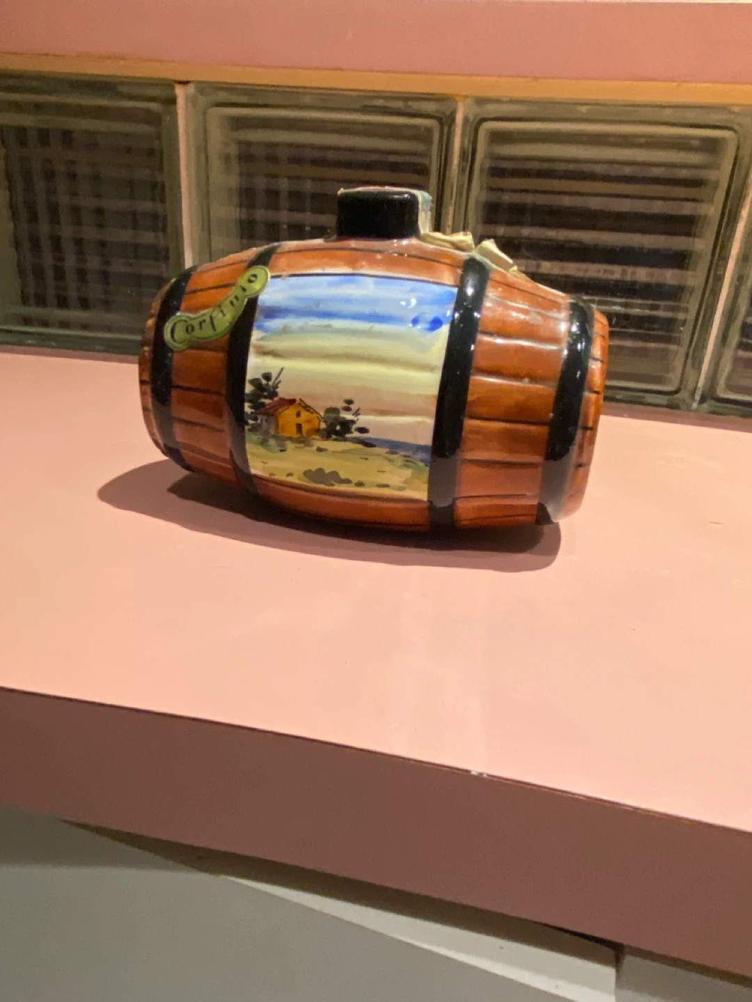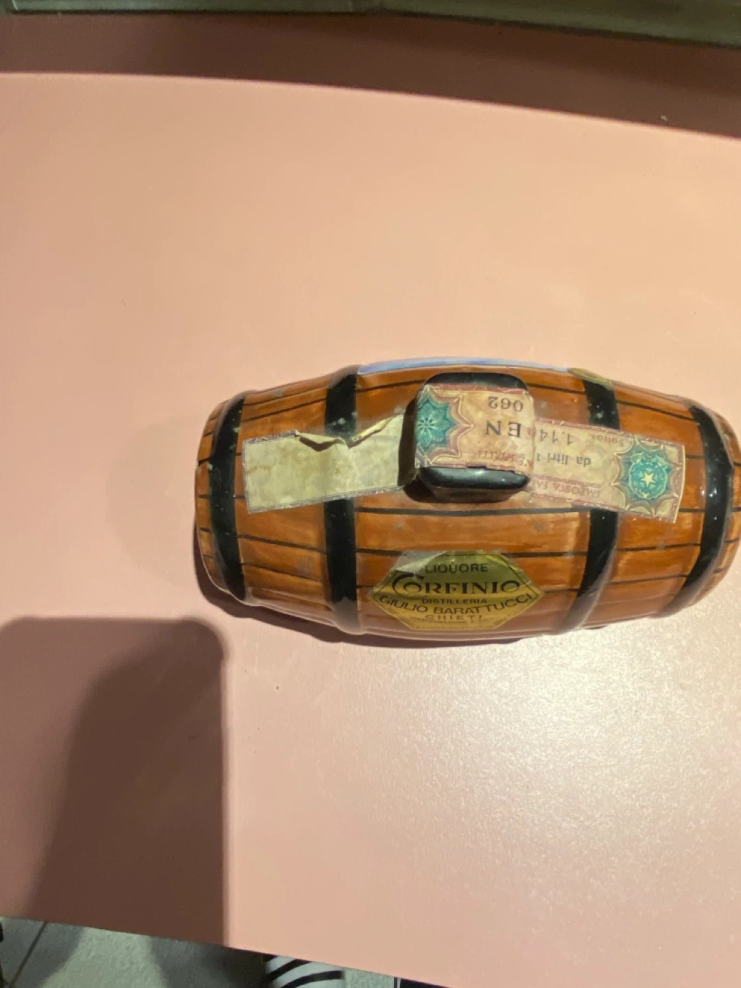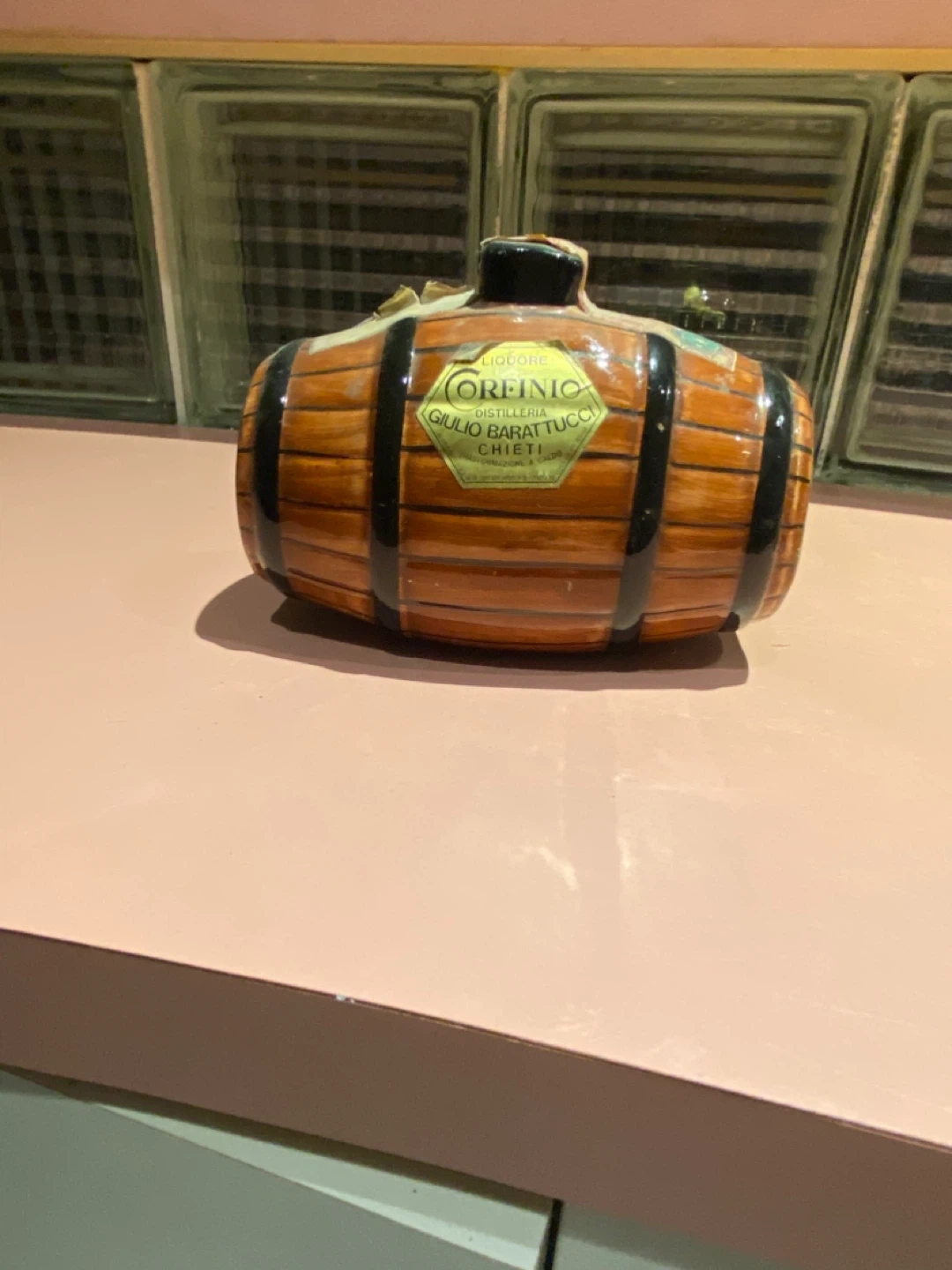 Ceramic bottle shaped like a barrel from Giulio Barattucci's "Corfinio" liqueur. It has a painted landscape on one side. This bottle would make a unique display piece.
