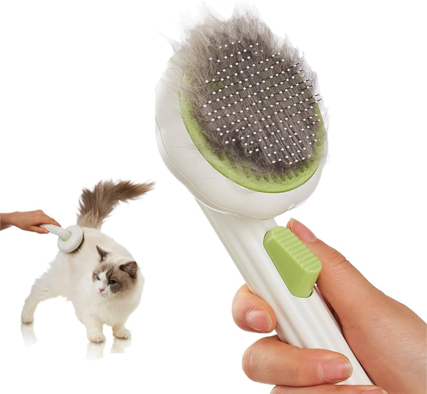 Groom your furry friend with this handy pet hair removal brush. It features a one-button self-cleaning mechanism to easily remove collected fur. The brush has fine bristles to effectively collect loose hair. Great for keeping your pet's coat tidy!