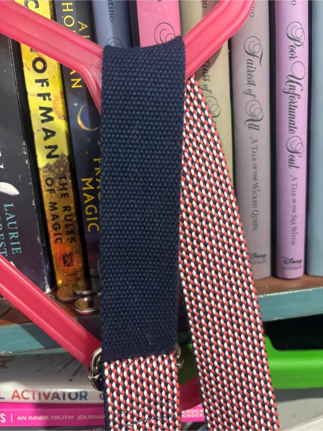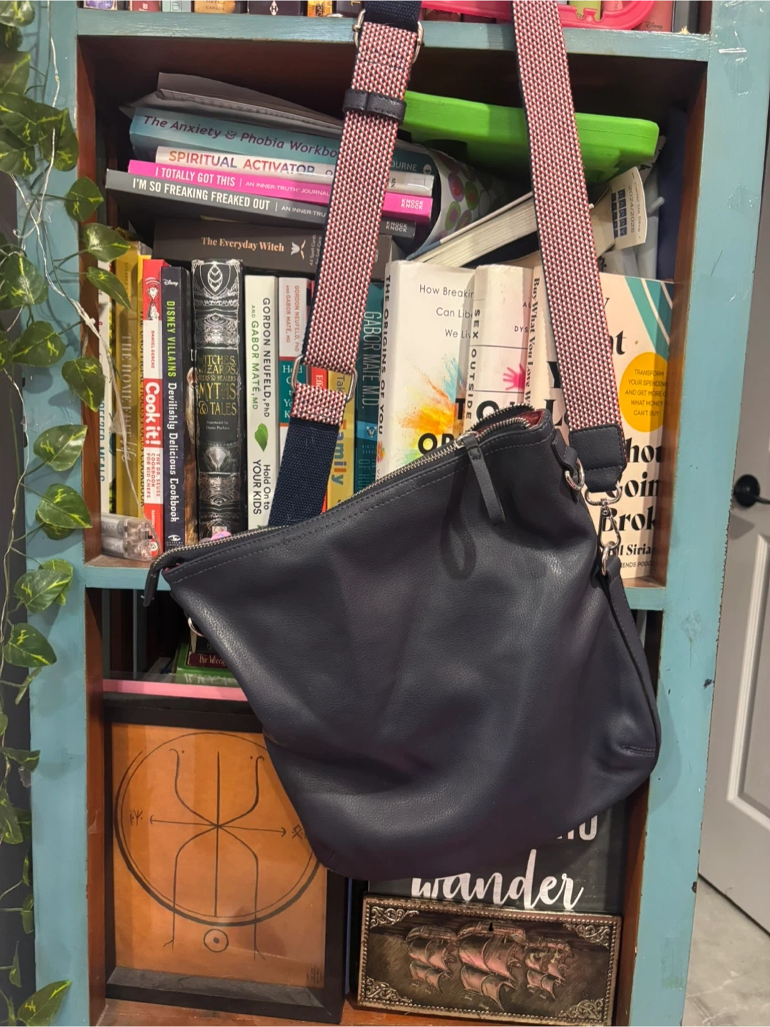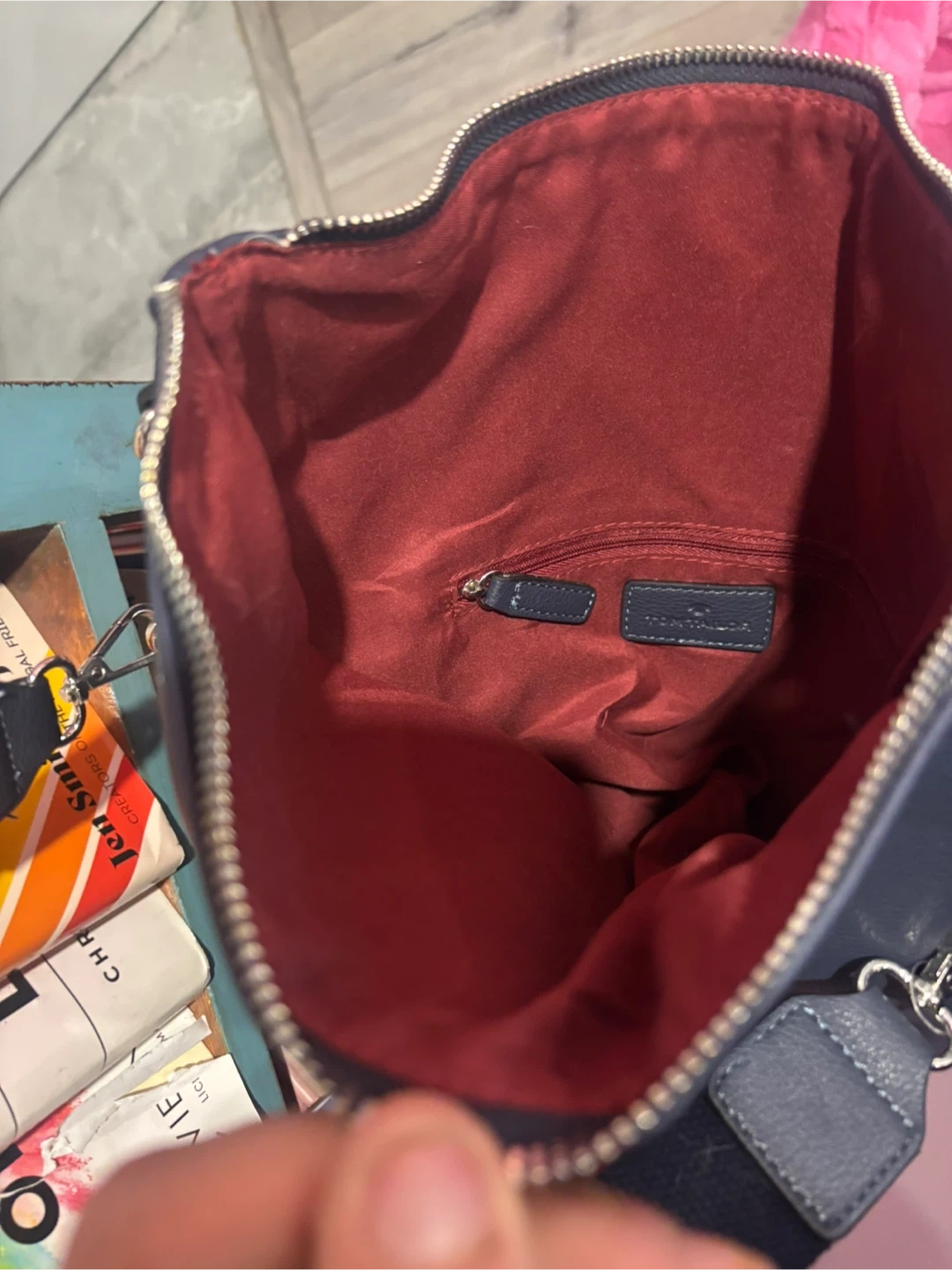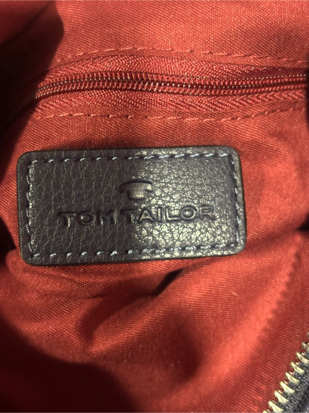 This is a Tom Taylor shoulder bag made from navy blue leather. It features a red interior lining and a detachable patterned strap. The bag has a zippered main compartment.