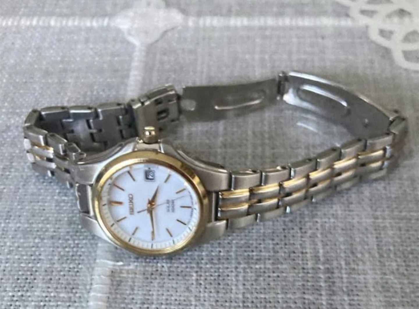 This is a two-tone stainless steel Seiko watch. It features a white dial with gold accents and a date window. The watch is solar-powered. Watch has been refurbished and working fine . Price is negotiable. Cash only .