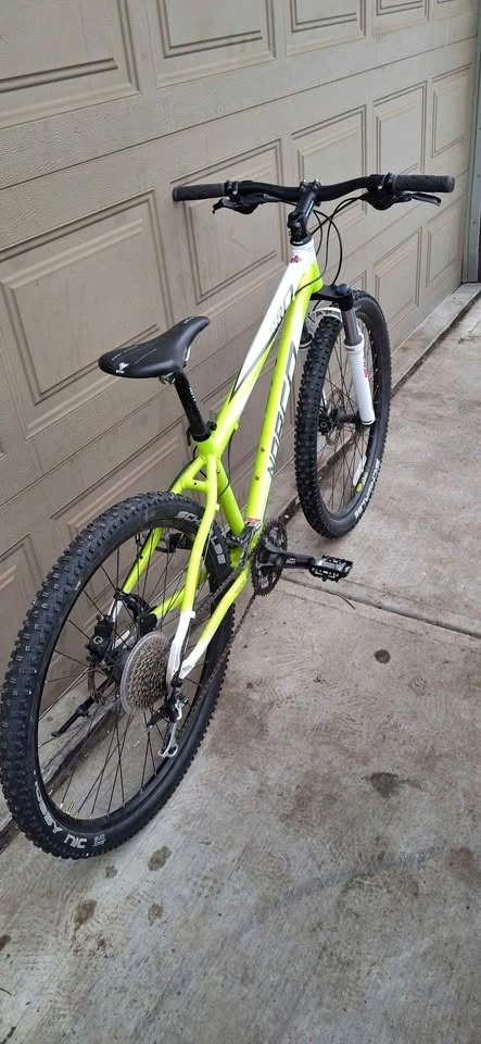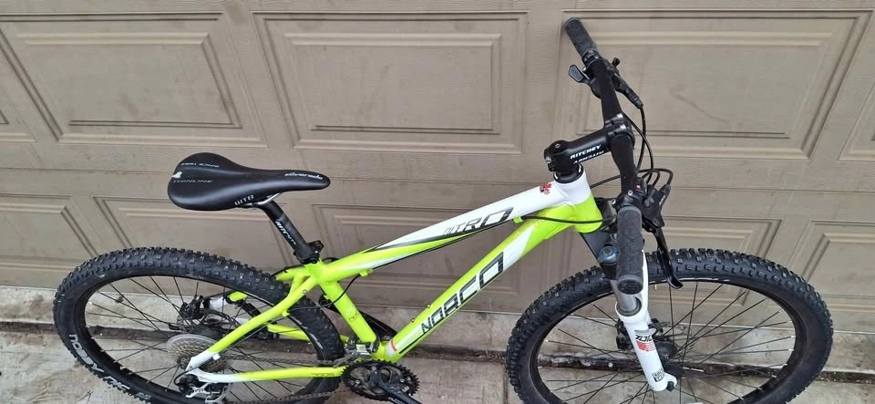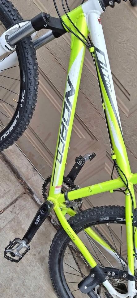 Selling a great condition Norco Nitro hardtail mountain bike, perfect for trail riding or daily commuting. The bike has a lightweight aluminum frame and a bright white and lime green color scheme.