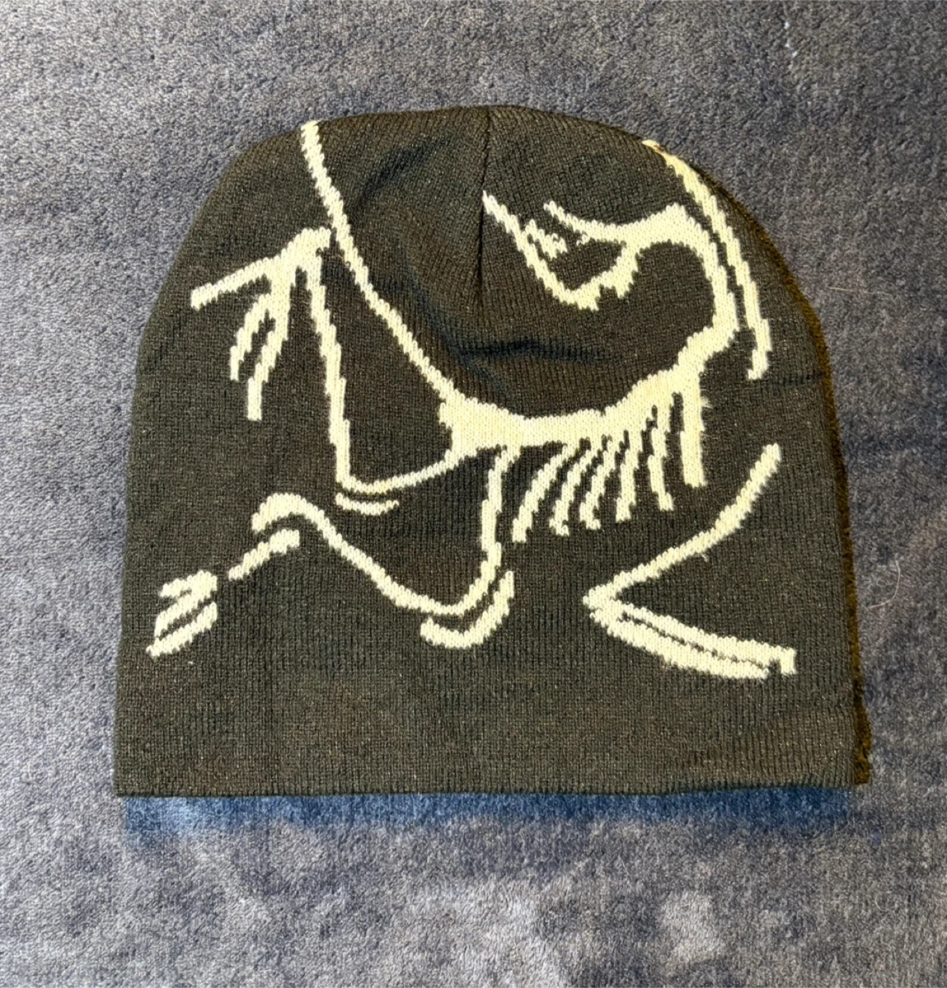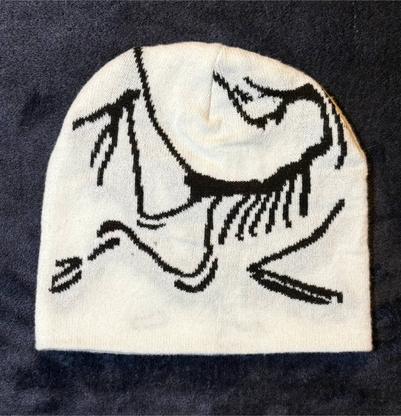 This is an Arc'teryx beanie with the iconic logo design. It's made of knitted material for warmth. This beanie is great for keeping your head cosy on chilly days!