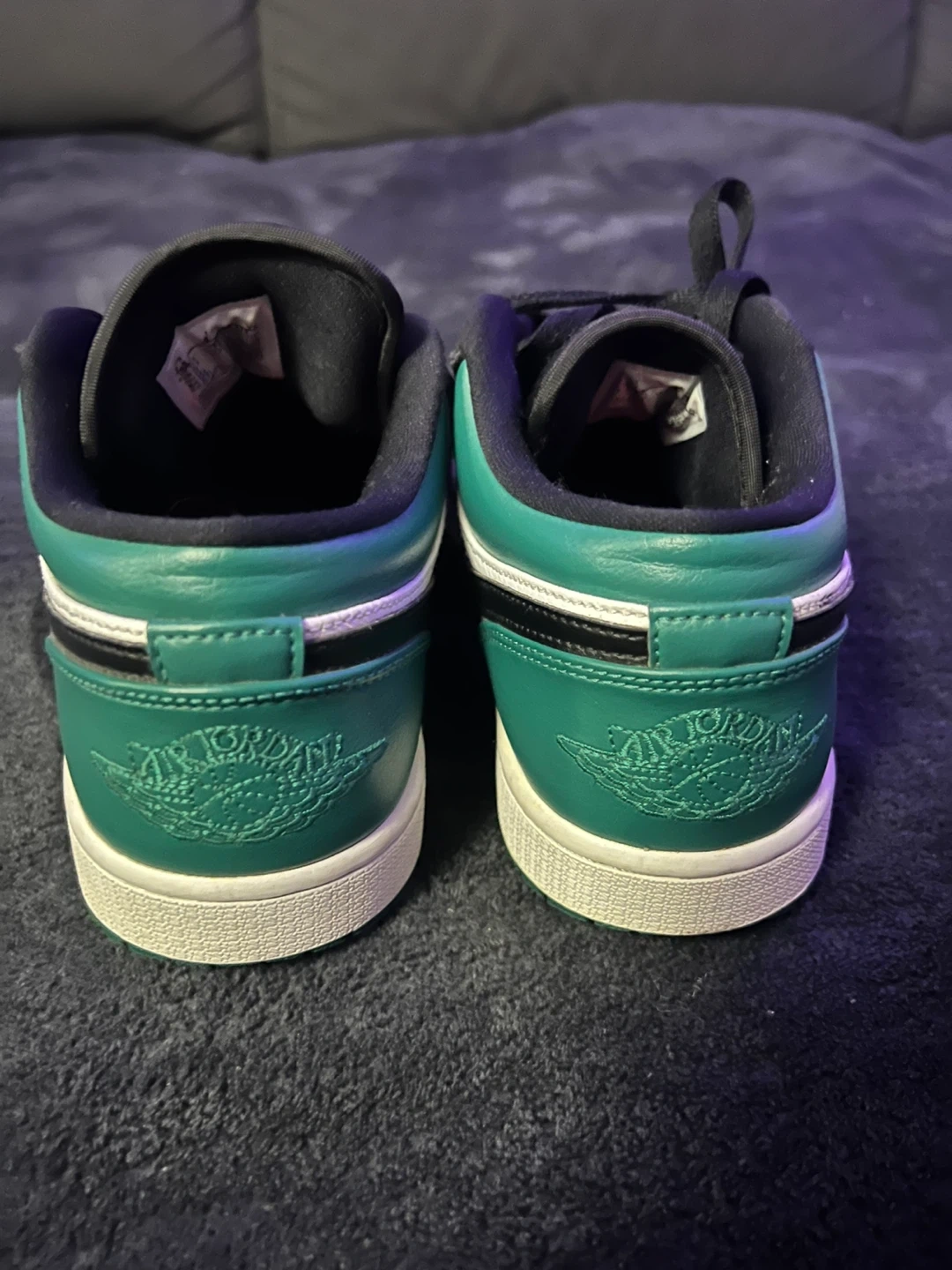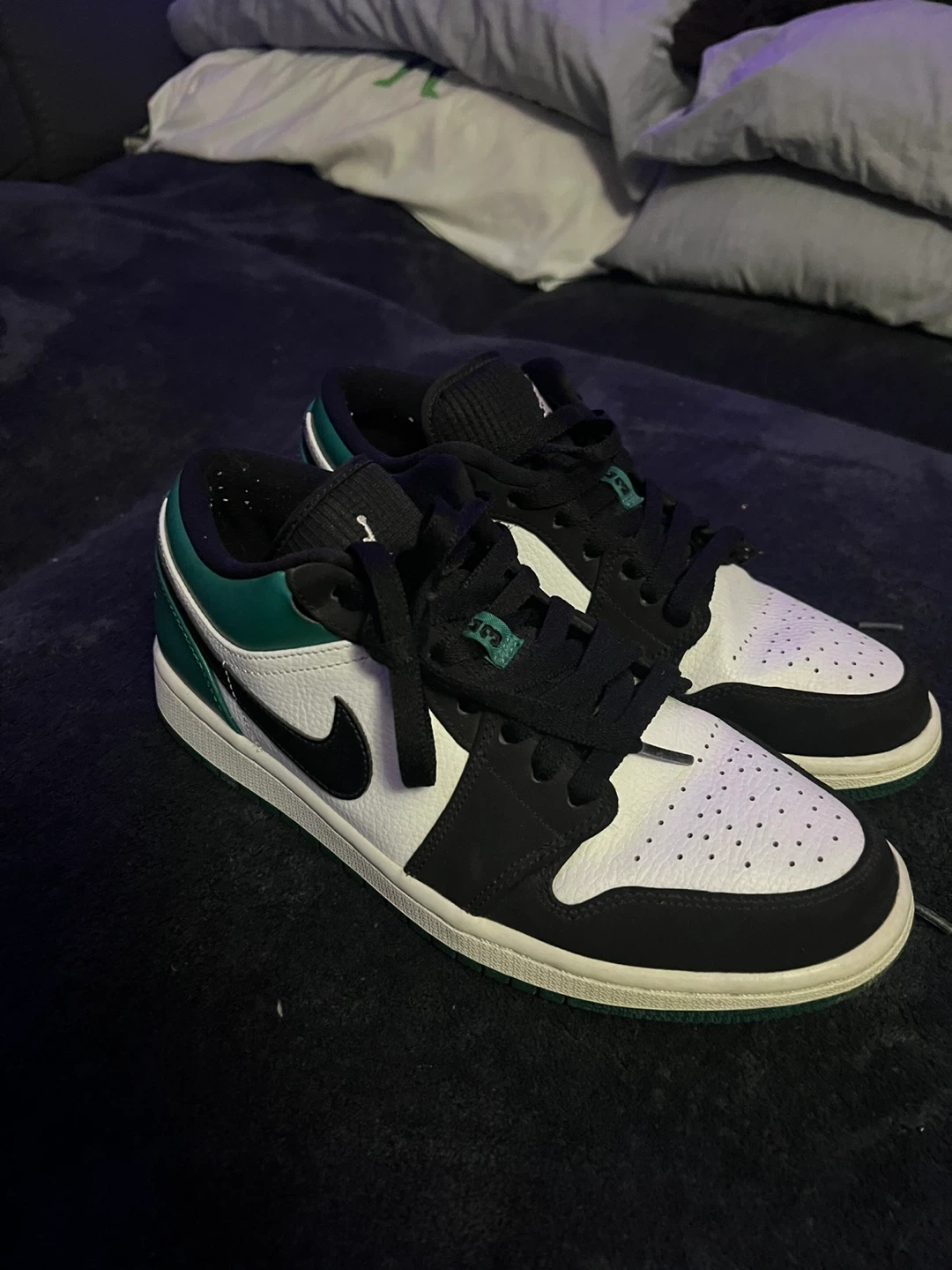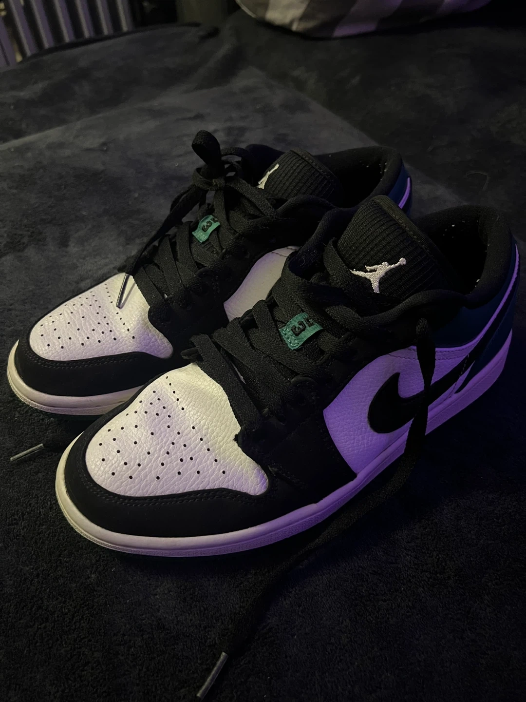 Air Jordan 1 Low SE sneakers in a black, white, and evergreen colourway. These kicks are made with leather and feature the iconic Jumpman logo.