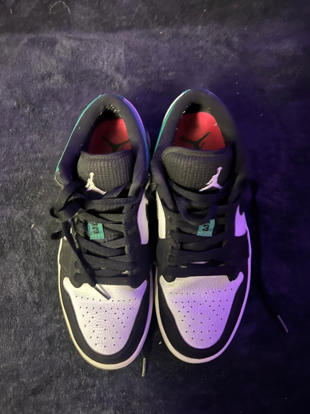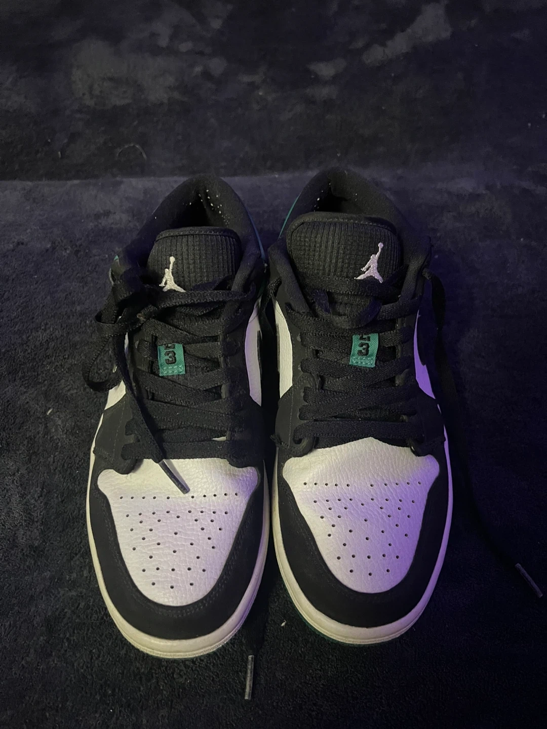 Air Jordan 1 Low SE sneakers in a black, white, and evergreen colourway. These kicks are made with leather and feature the iconic Jumpman logo.