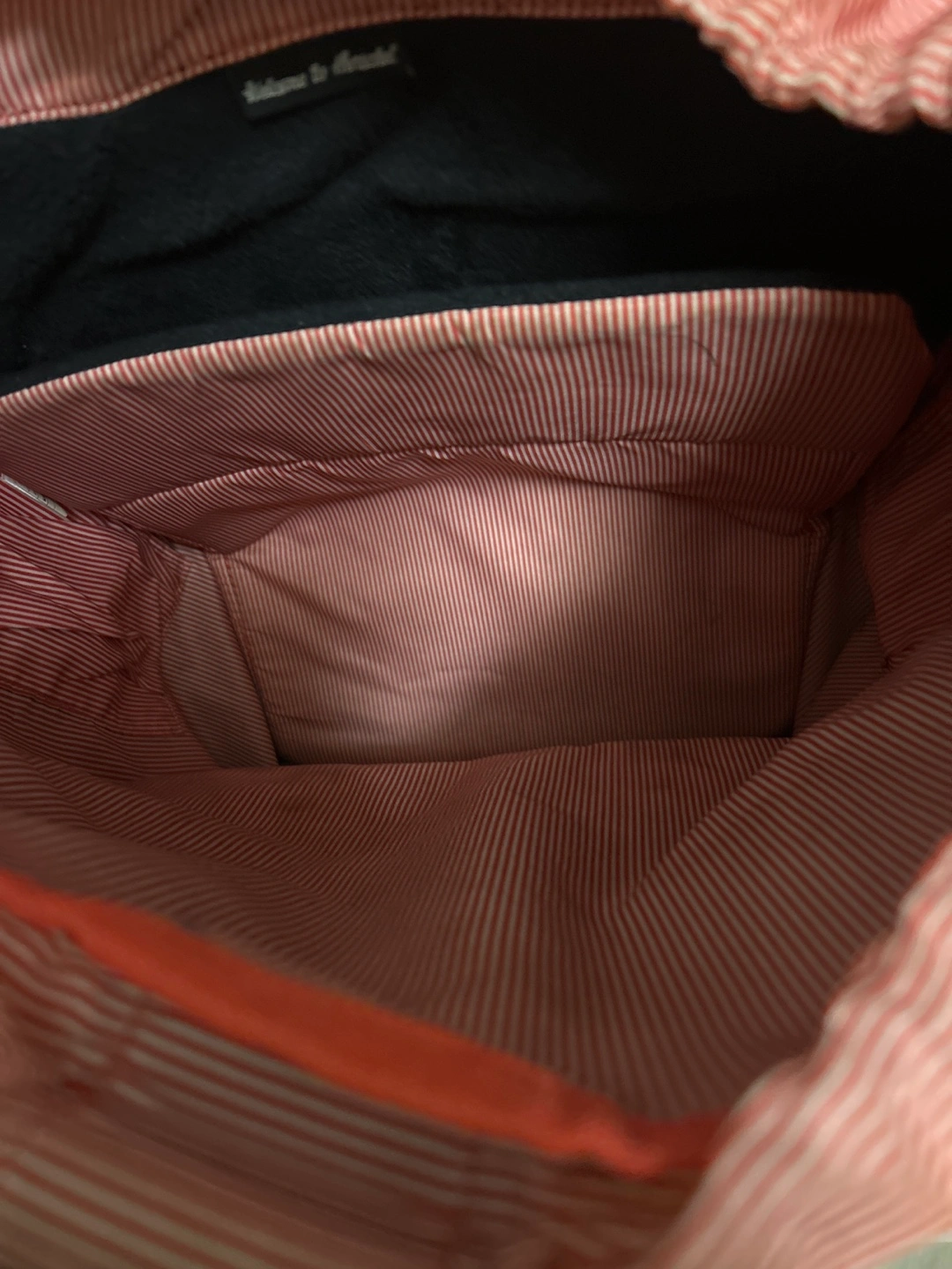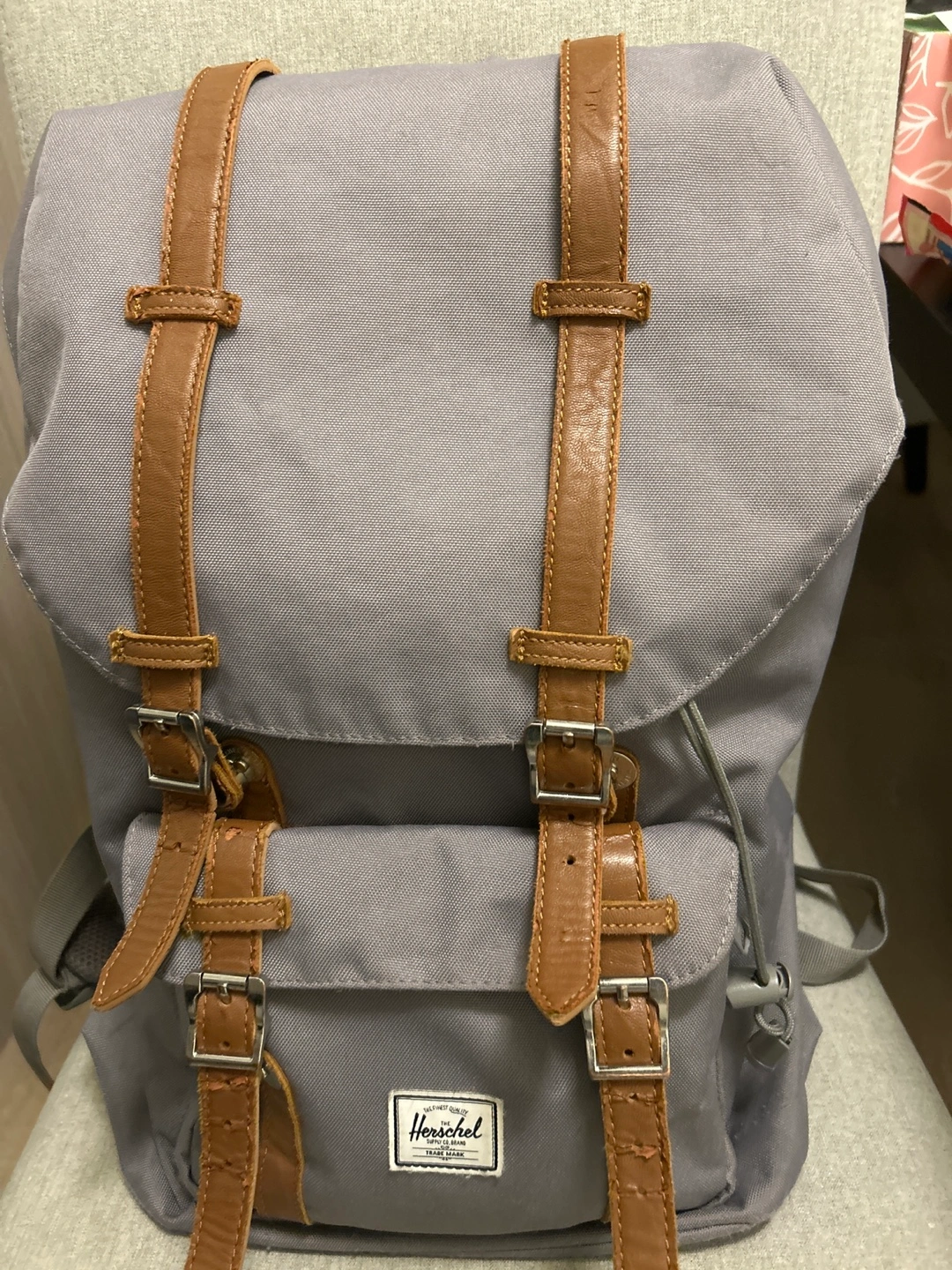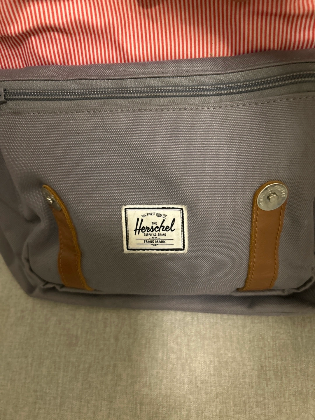 Grey Herschel backpack with signature red and white striped interior. Features leather strap accents and a drawstring closure. It has multiple compartments and adjustable shoulder straps.
