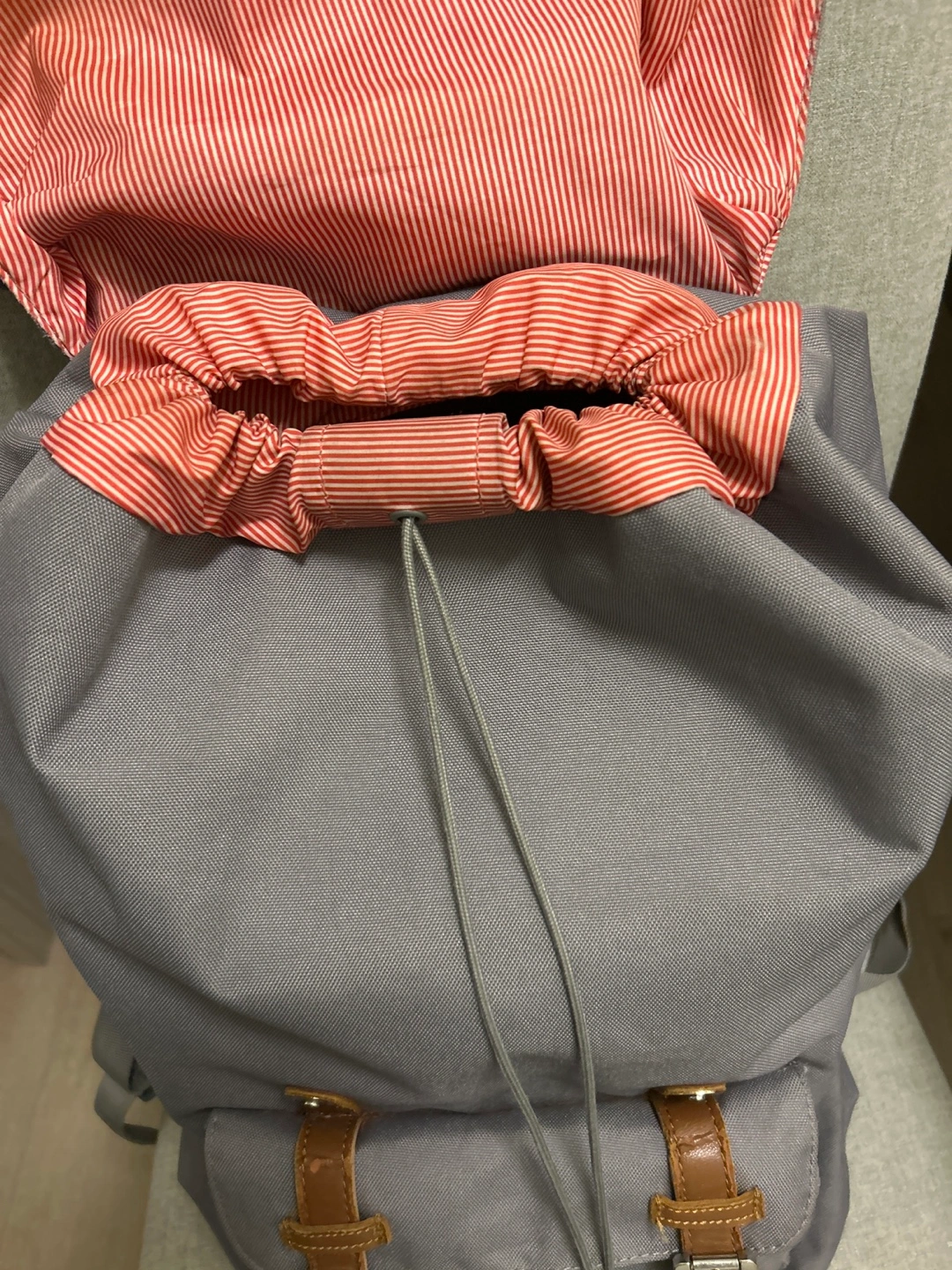 Grey Herschel backpack with signature red and white striped interior. Features leather strap accents and a drawstring closure. It has multiple compartments and adjustable shoulder straps.
