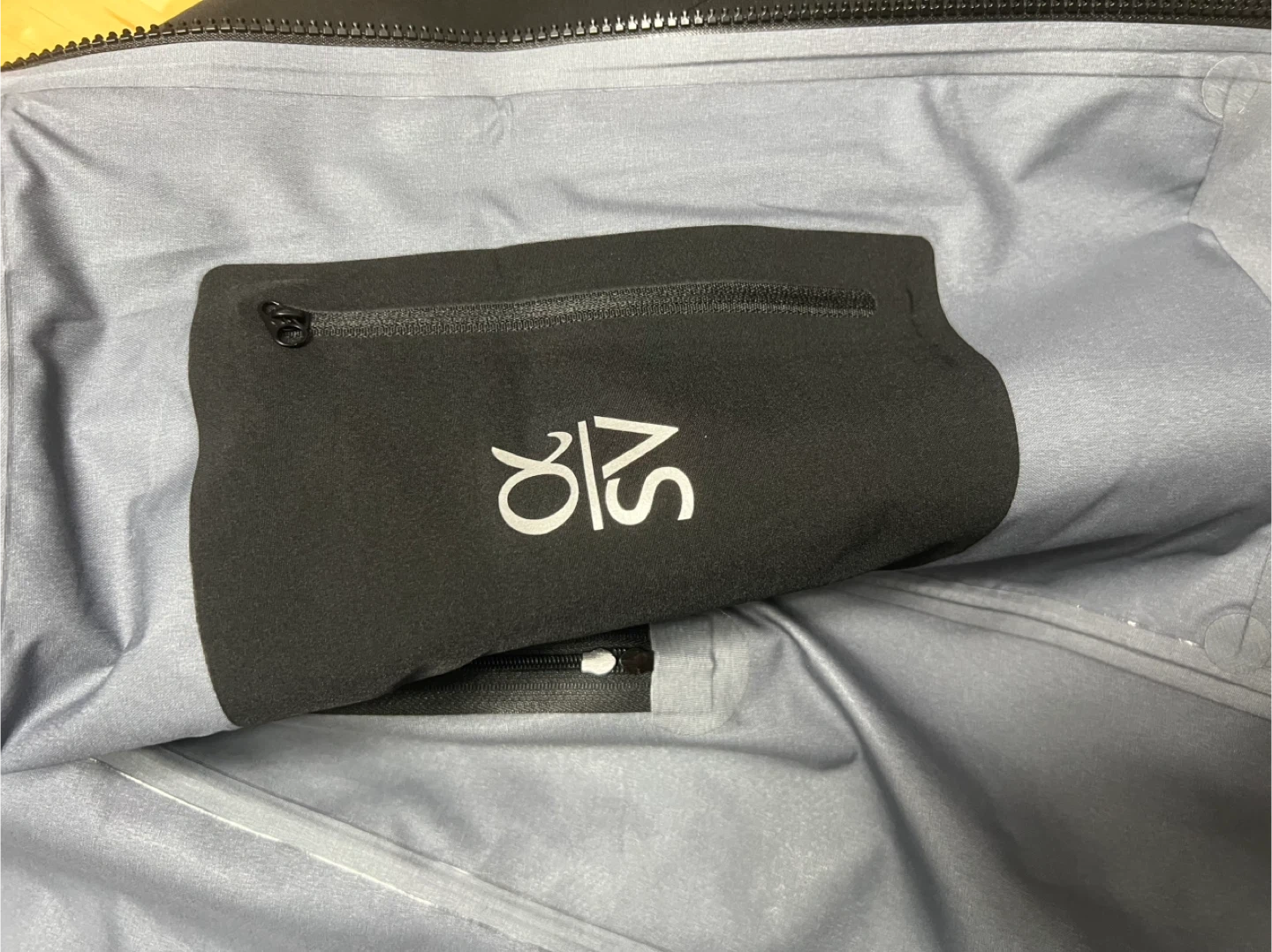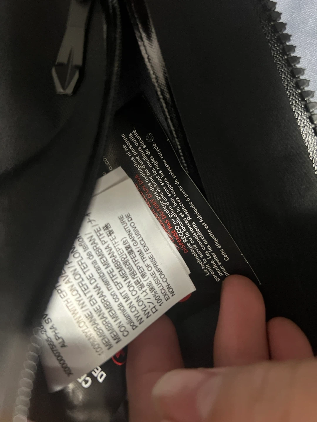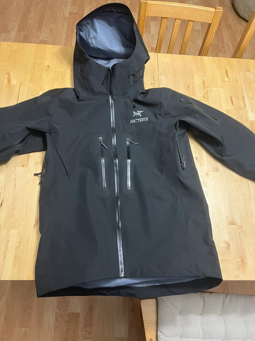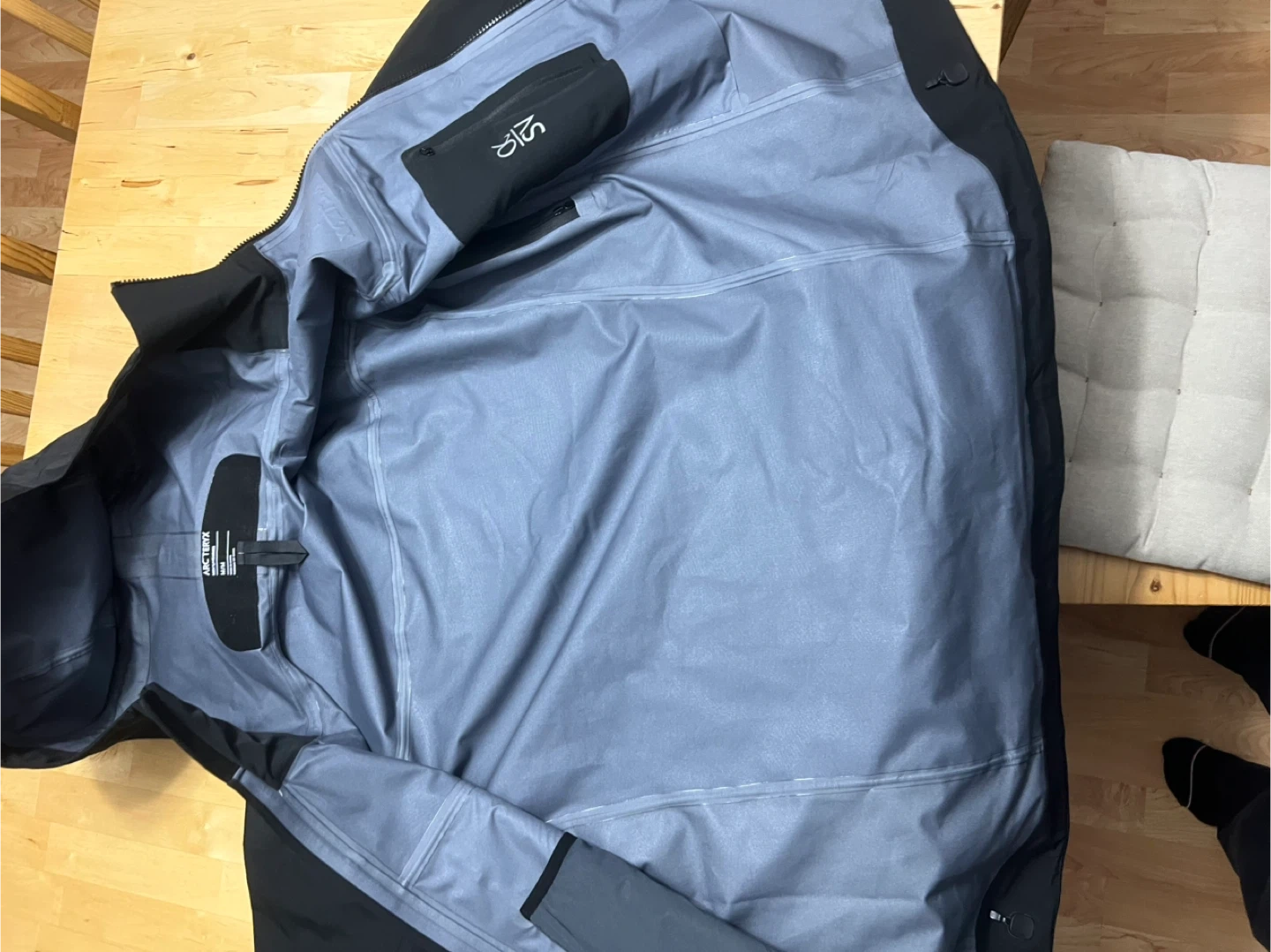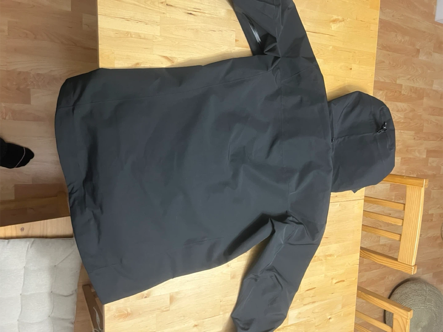This is an Arc'teryx black waterproof jacket. It's made with durable materials for outdoor use. Features multiple zippered pockets and an adjustable hood. Perfect for hiking or skiing!