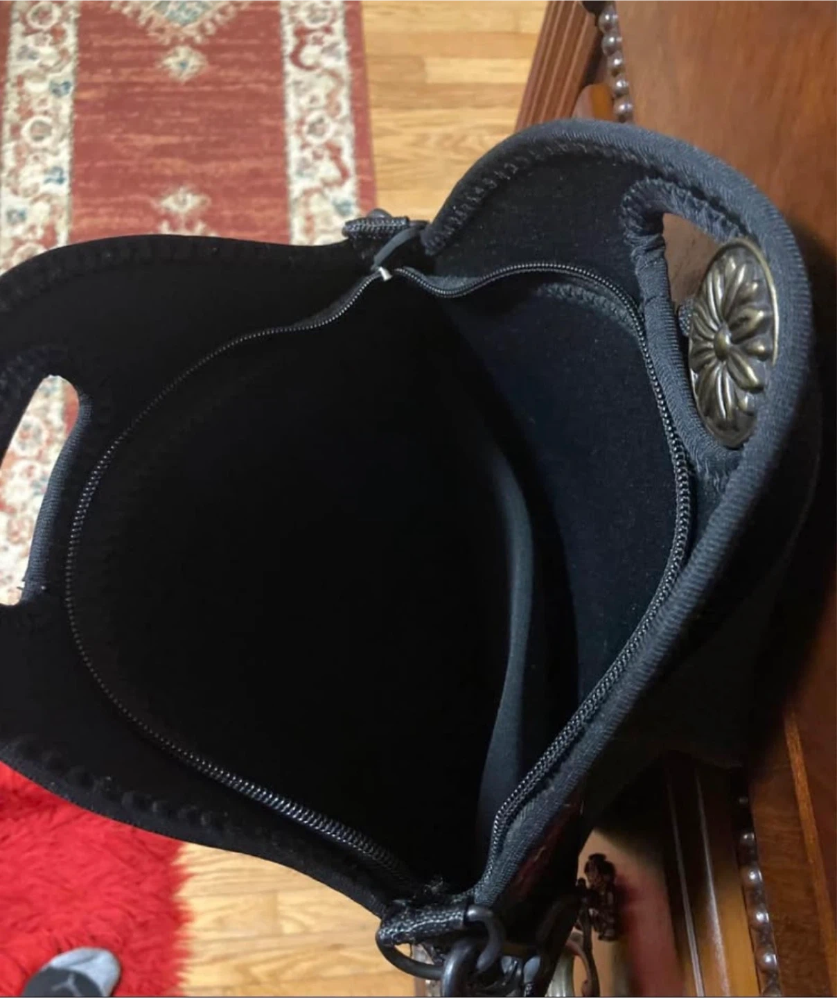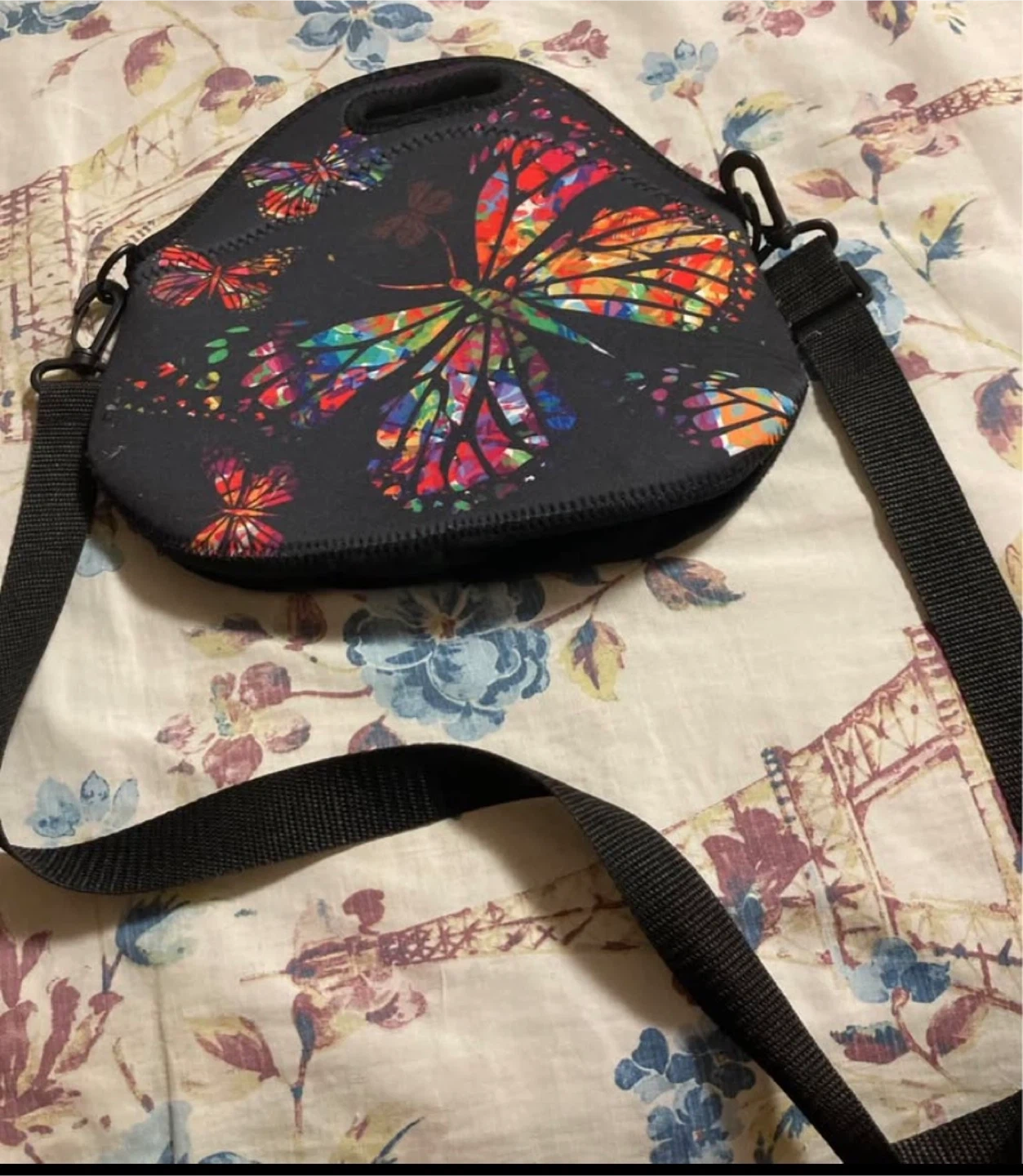 This black lunch bag features a vibrant butterfly print. It's made of insulated neoprene material and includes a detachable shoulder strap. The zippered closure keeps contents secure.