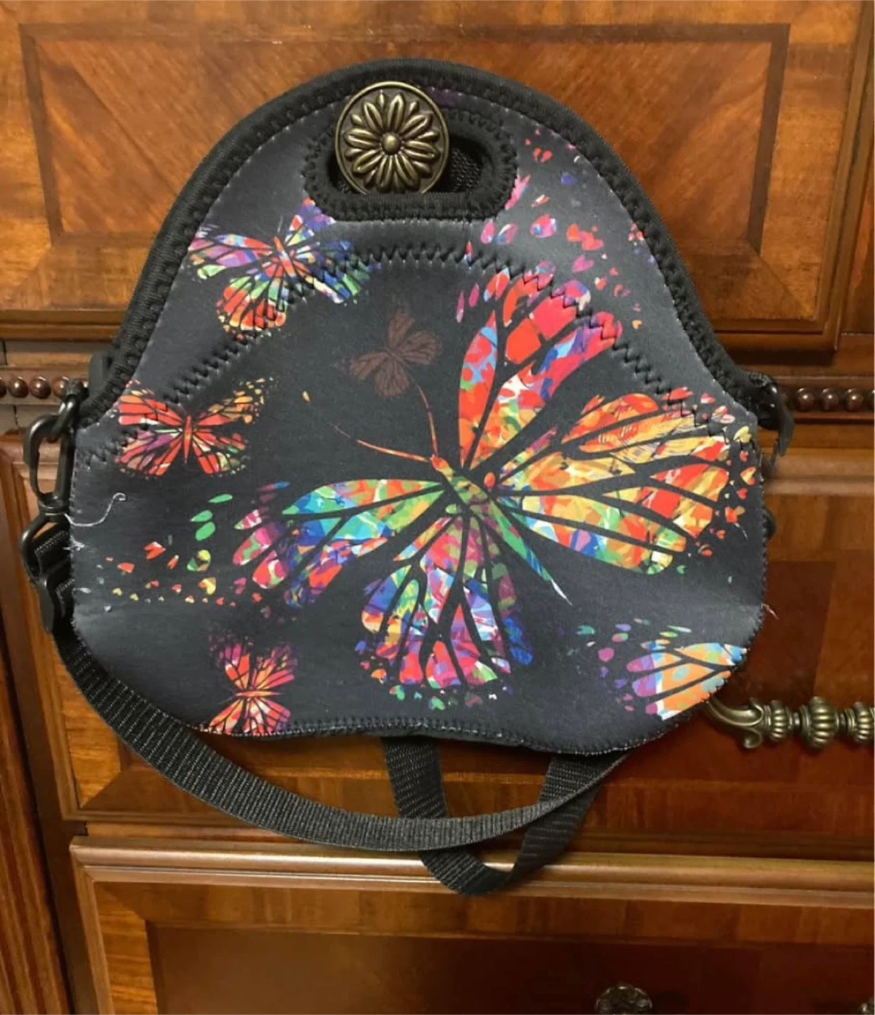 This black lunch bag features a vibrant butterfly print. It's made of insulated neoprene material and includes a detachable shoulder strap. The zippered closure keeps contents secure.