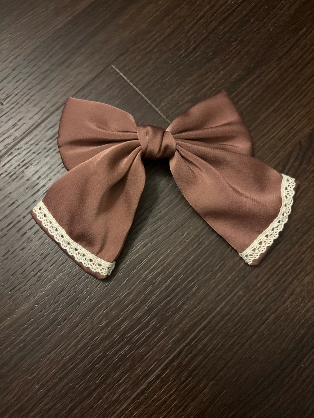 This is a lovely bow hair clip with delicate white lace trim. It's secured with a sturdy metal clip. A cute accessory for any hairstyle!