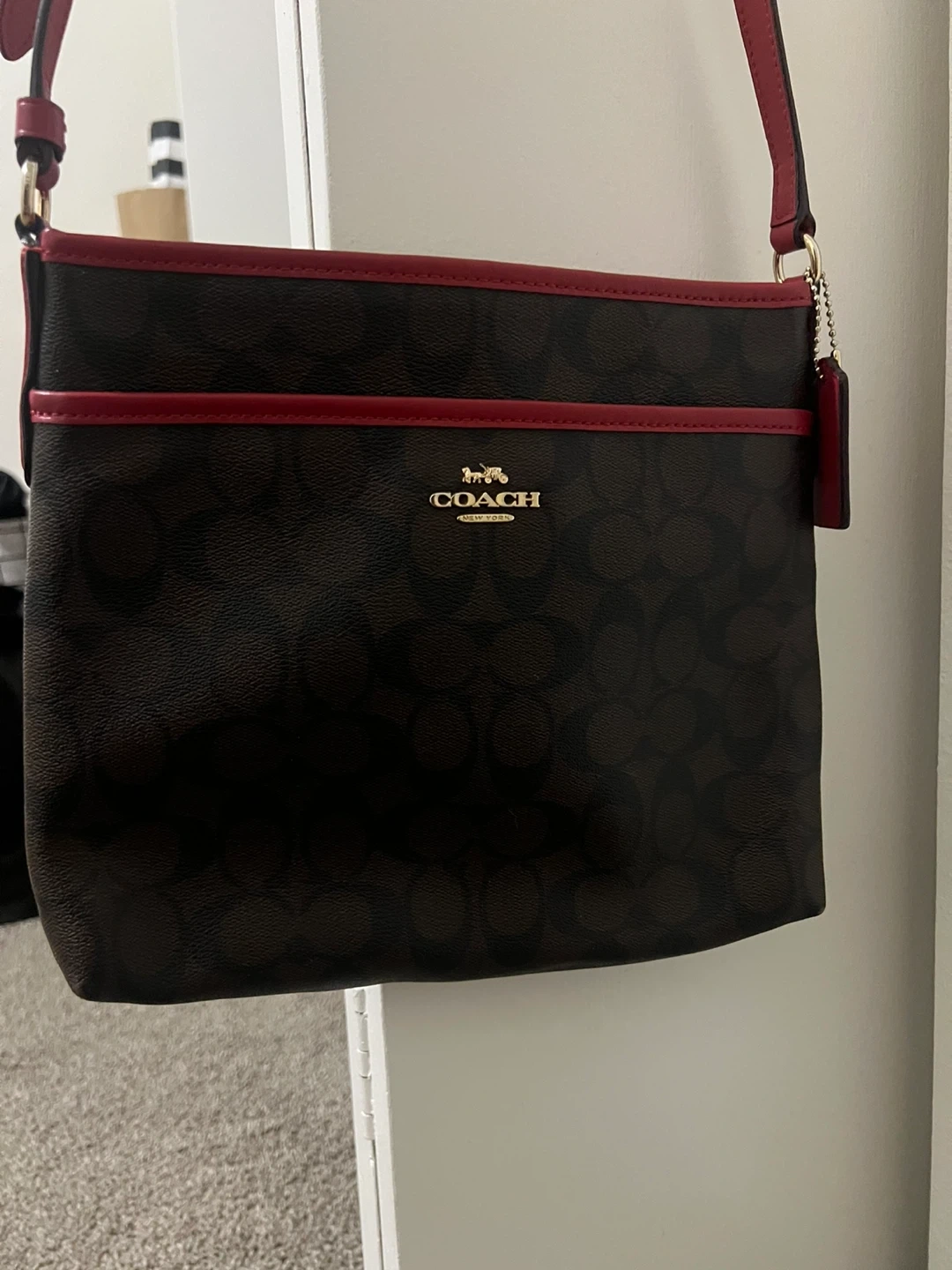 This is a Coach crossbody bag featuring the signature "C" pattern in brown and black. It has a red trim and red hang tag. It's a stylish accessory for everyday use.