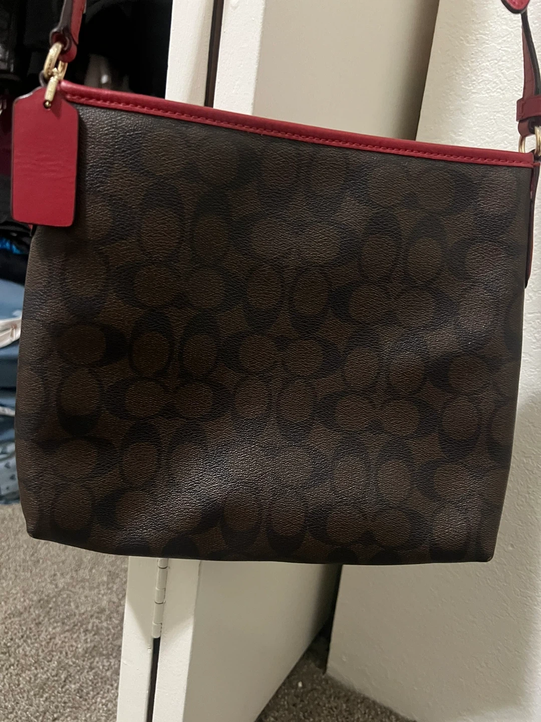 This is a Coach crossbody bag featuring the signature "C" pattern in brown and black. It has a red trim and red hang tag. It's a stylish accessory for everyday use.
