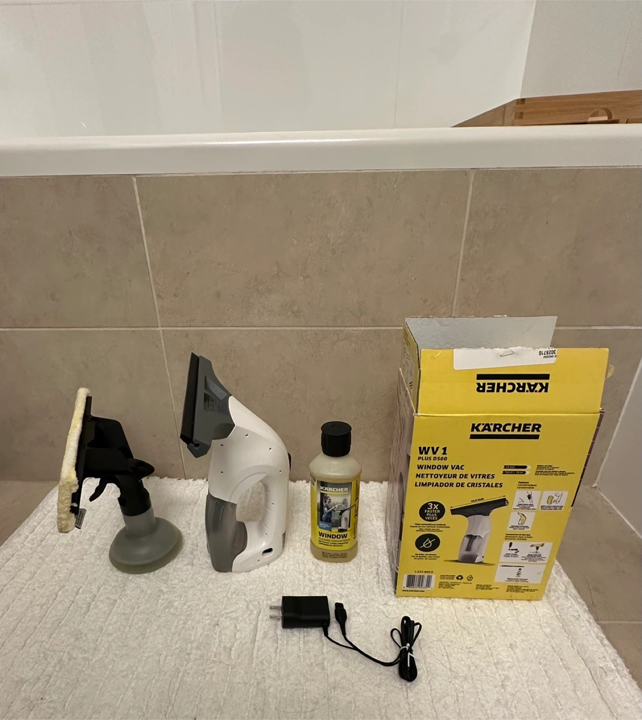 This Karcher WV 1 window vac comes with a spray bottle and cleaning concentrate. It's designed for streak-free window cleaning. Get your windows sparkling clean in no time!
