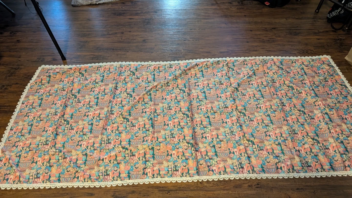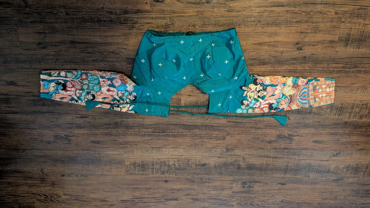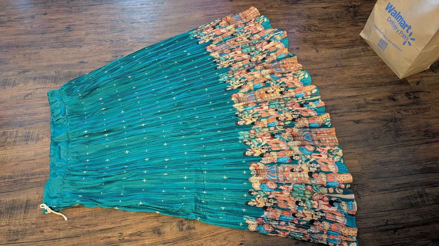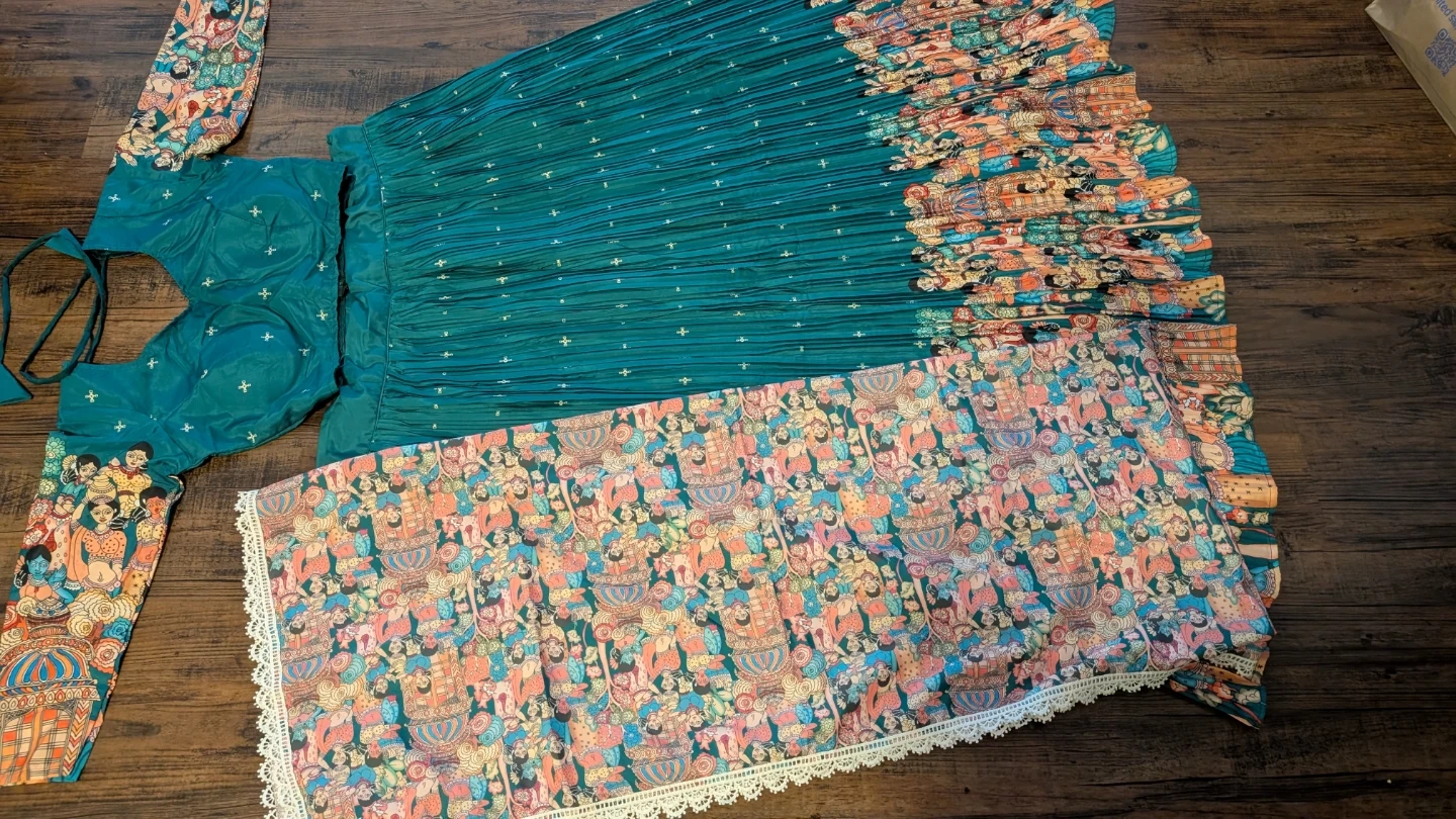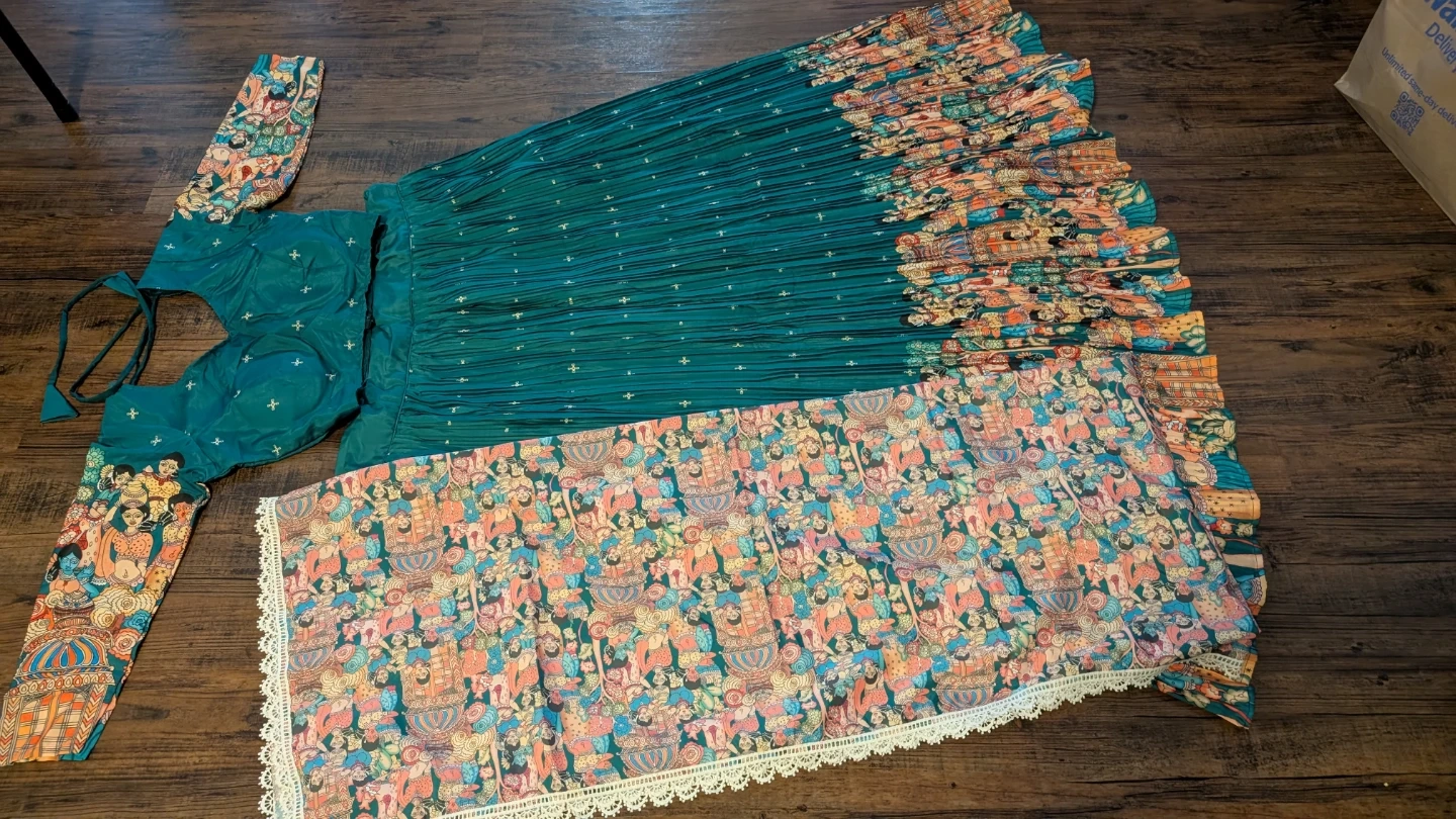This is a teal-coloured lehenga choli set with a matching dupatta. The lehenga and dupatta feature a colourful, intricate pattern. The choli has long sleeves and a sweetheart neckline with a tie-back closure. It's a beautiful outfit for special occasions!