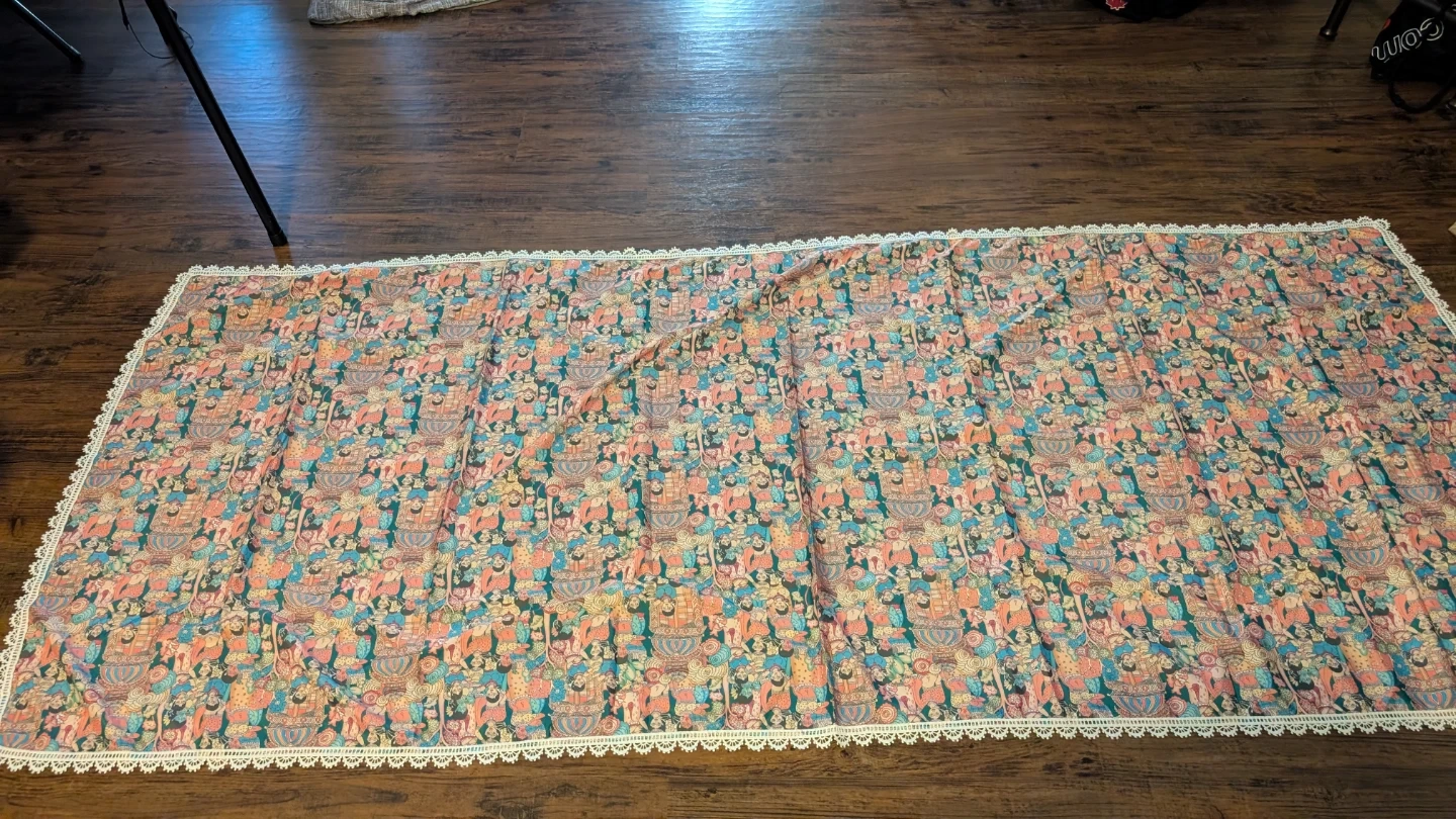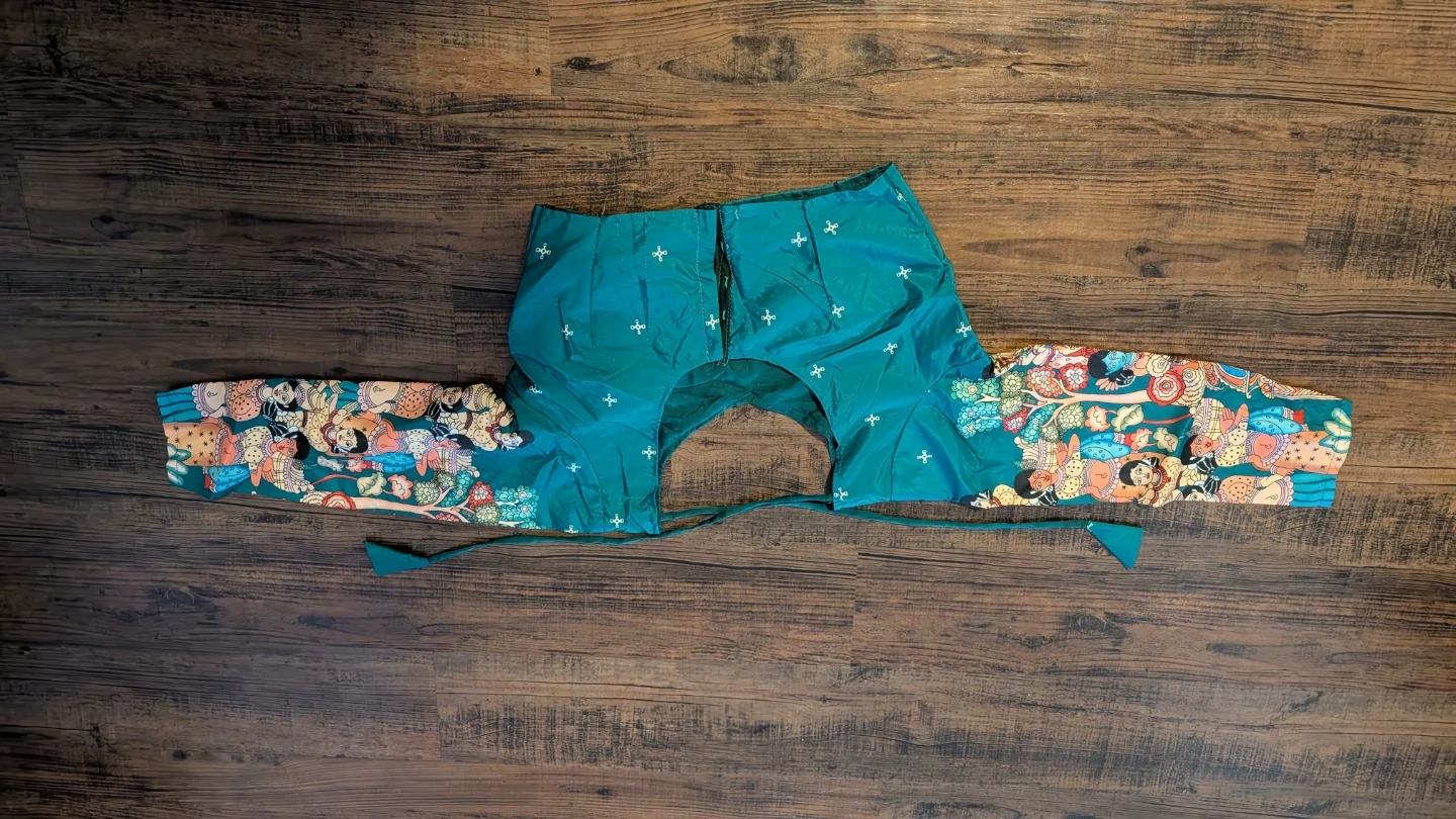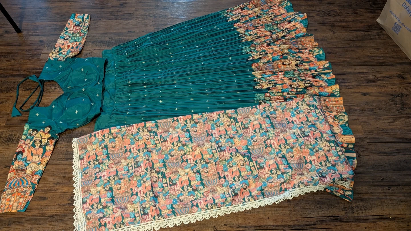 This is a teal-coloured lehenga choli set with a matching dupatta. The lehenga and dupatta feature a colourful, intricate pattern. The choli has long sleeves and a sweetheart neckline with a tie-back closure. It's a beautiful outfit for special occasions!