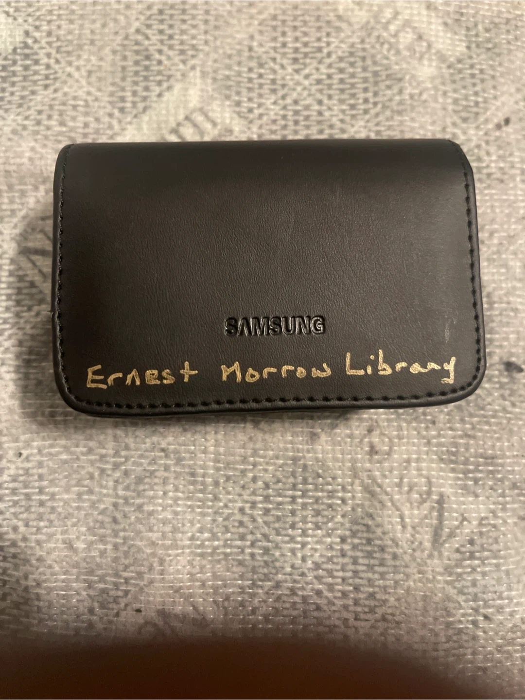 This is a Samsung S85 digital camera. It comes with a black Samsung pouch with a belt clip. The pouch has "Ernest Morrow Library" written on it.