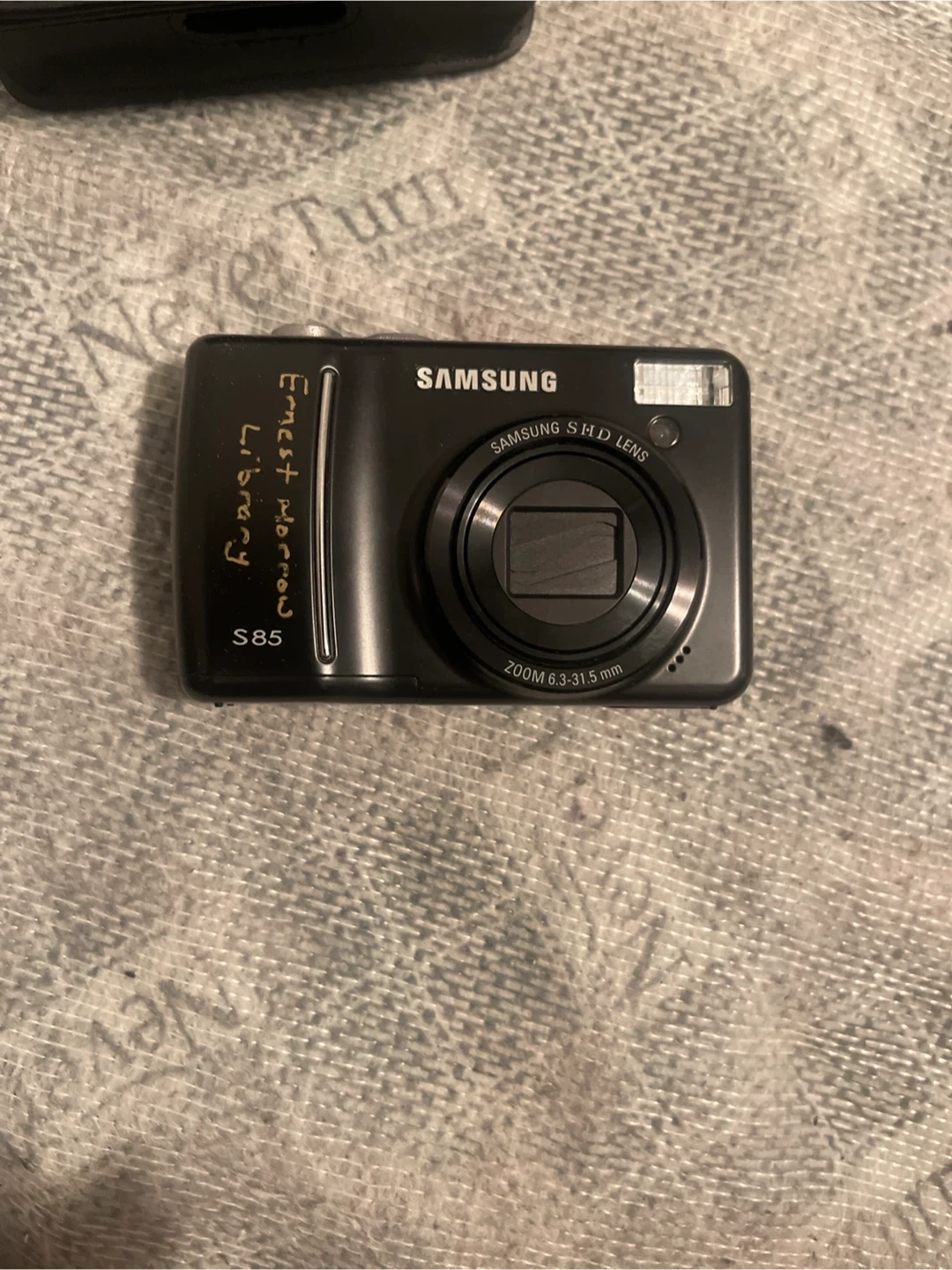 This is a Samsung S85 digital camera. It comes with a black Samsung pouch with a belt clip. The pouch has "Ernest Morrow Library" written on it.