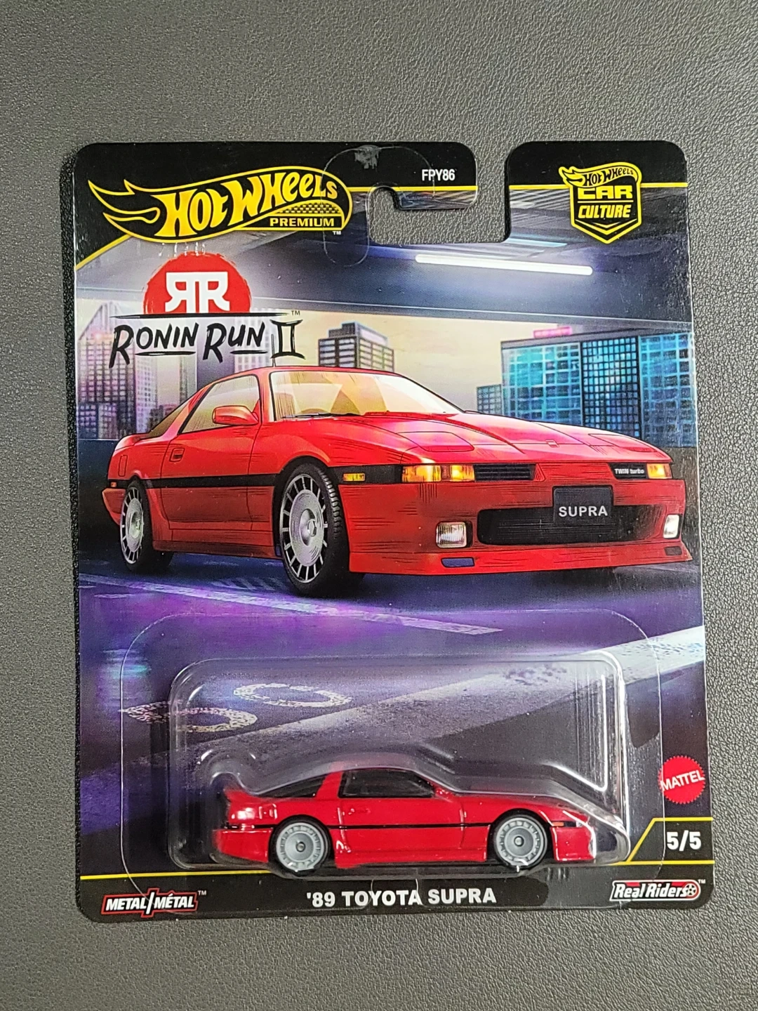 This is a Hot Wheels Premium die-cast car featuring the '89 Toyota Supra. It's part of the Ronin Run II series and includes Real Riders wheels. The car is red with black accents.