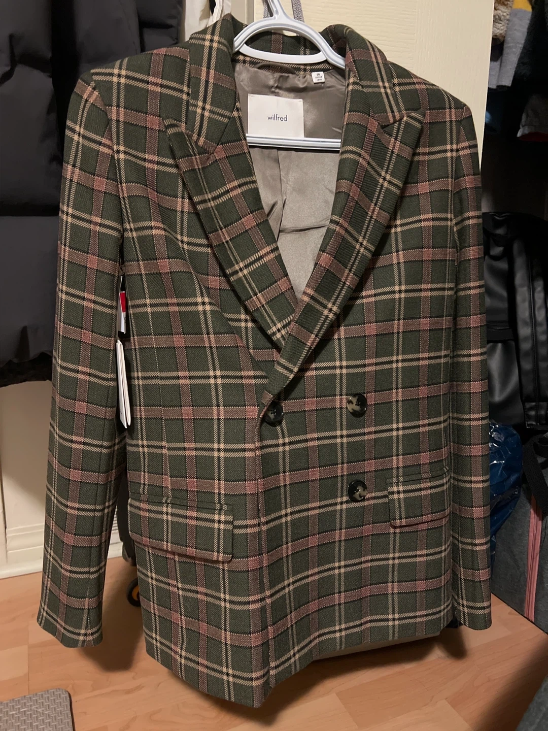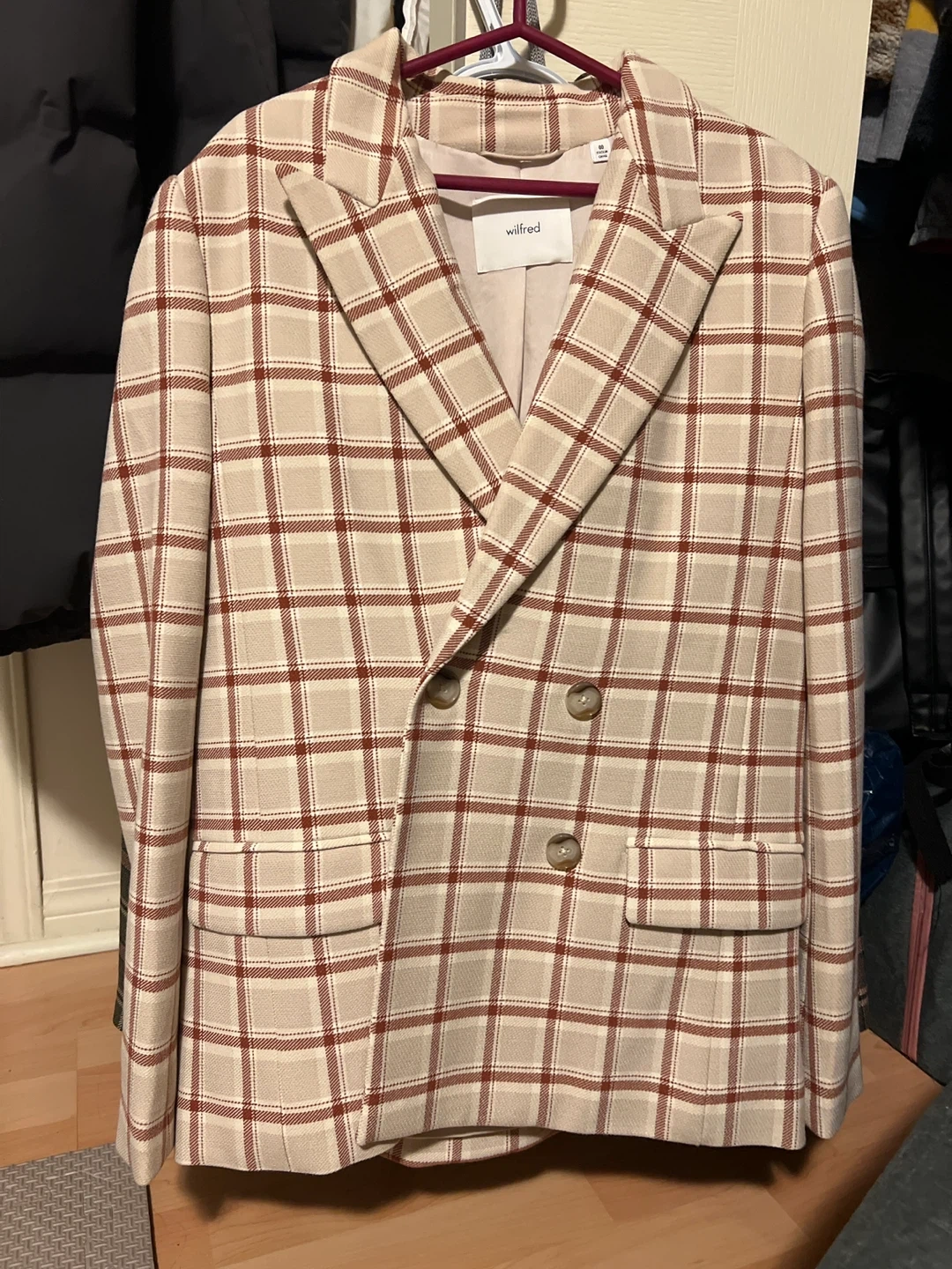 2 Wilfred plaid double-breasted blazer. Both have classic fit and button closure. This jacket's pattern makes it a stylish layering piece.