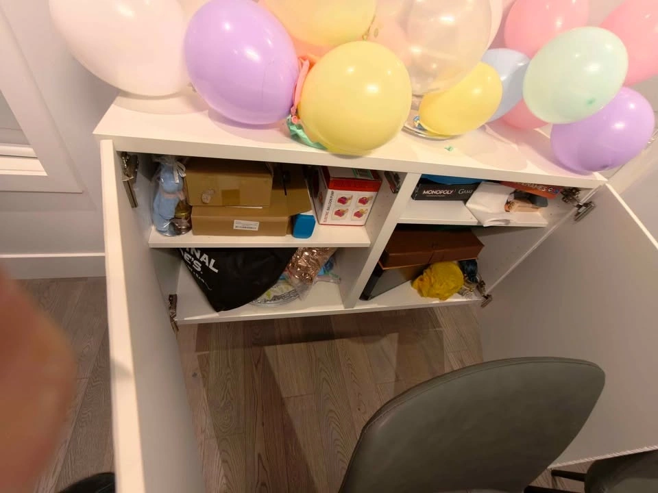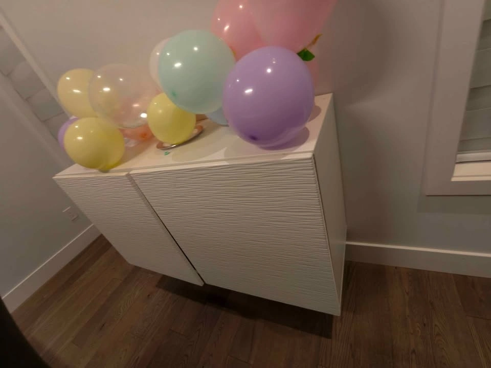 Stylish white floating cabinet with textured doors and two compartments inside for storage. Great for entryway, living room, or under a TV. Super clean, looks almost new! You must come and take it off the wall yourself.